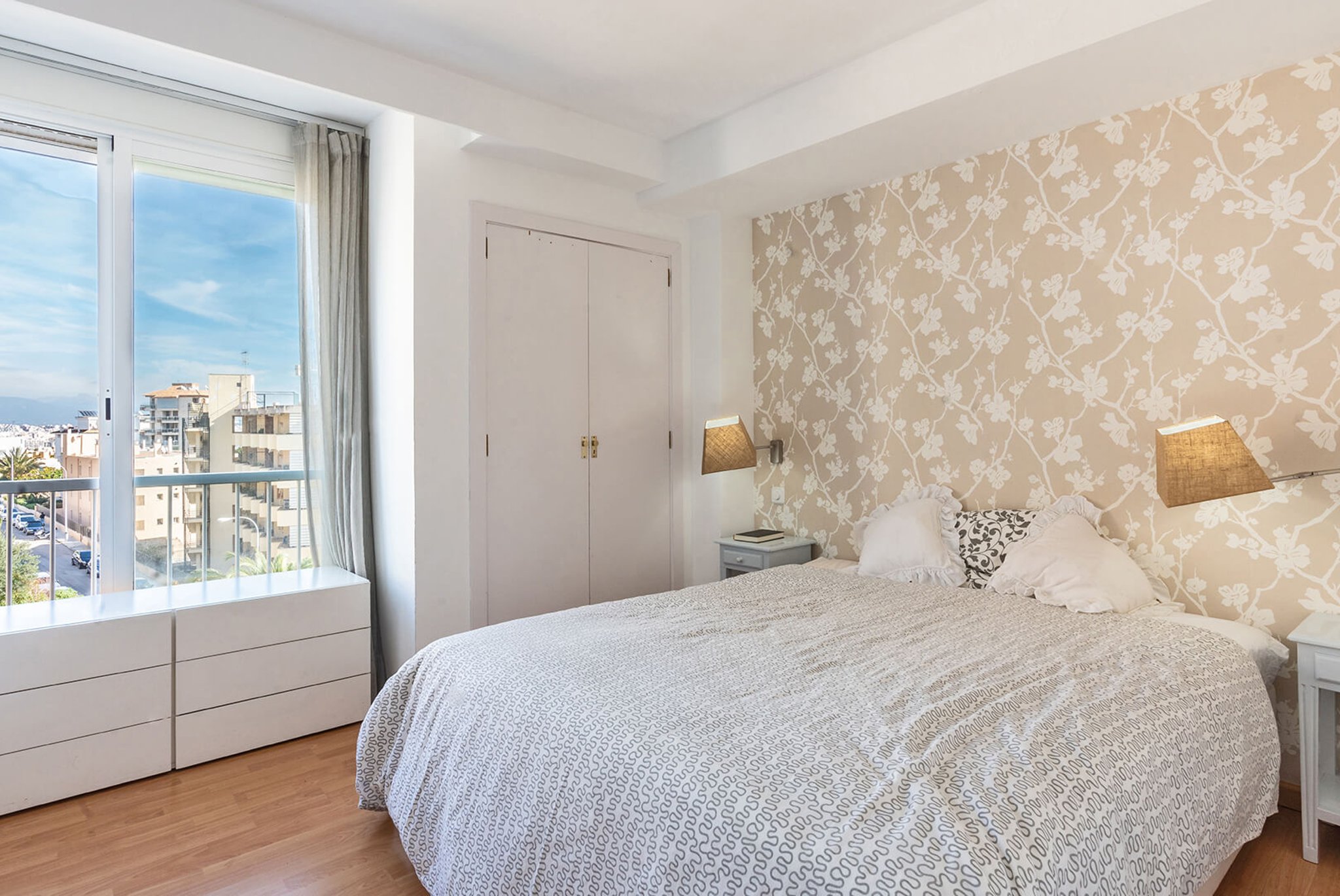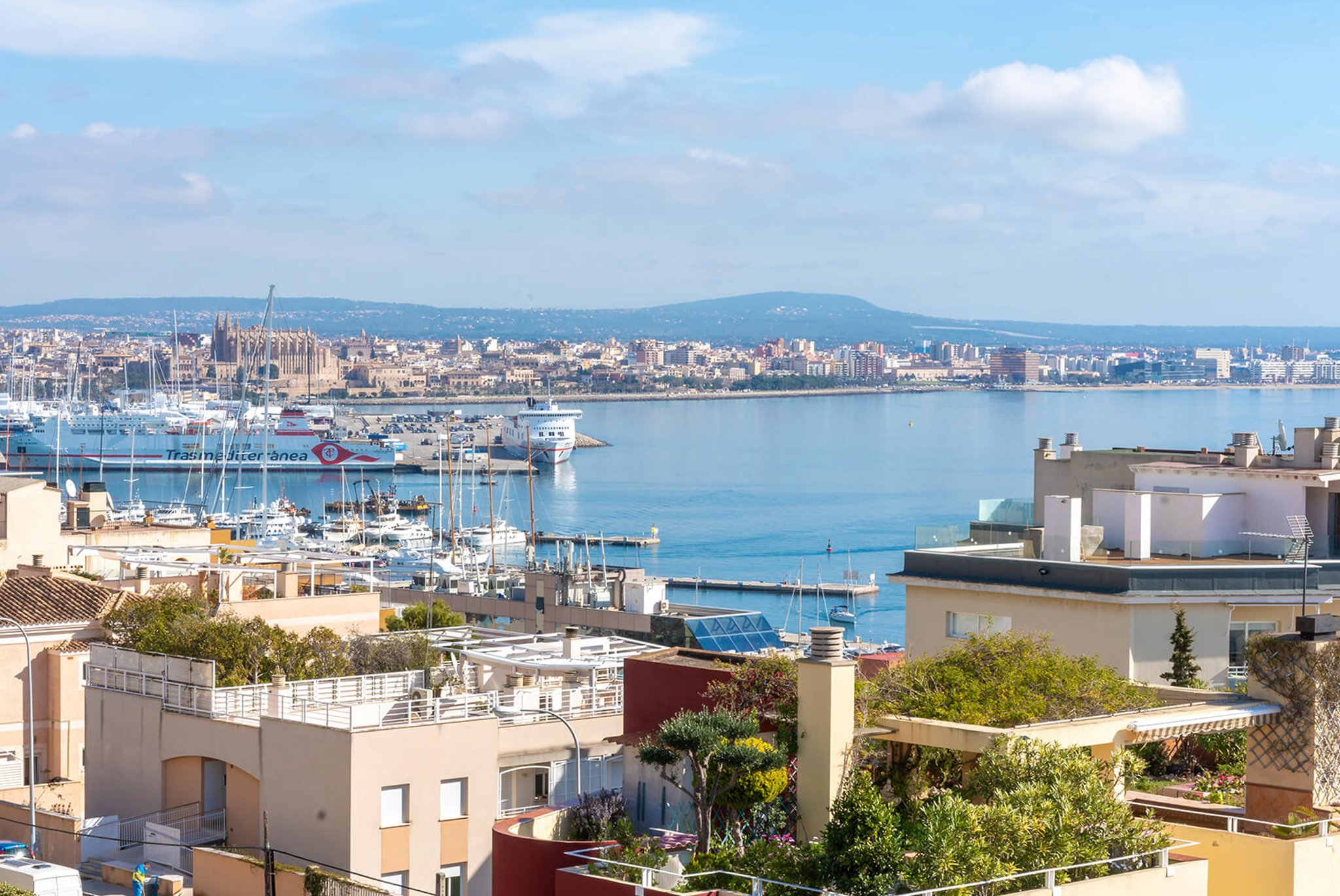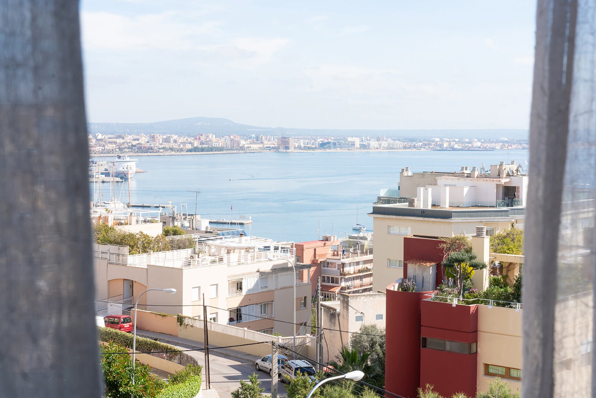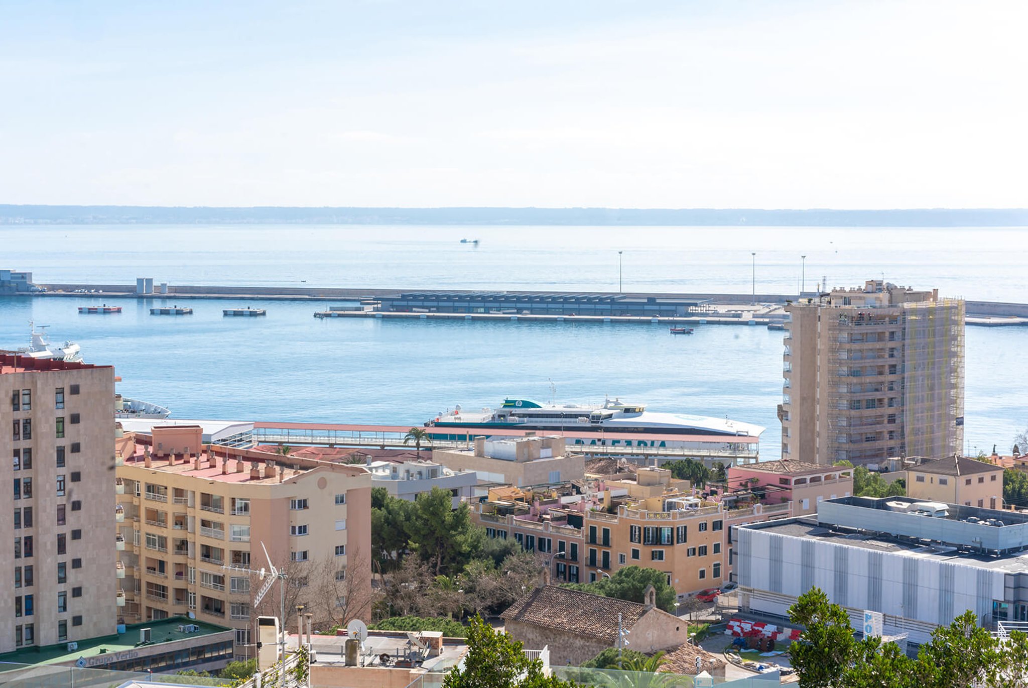 The property is located on the fifth floor in a building with communal pool and garden. The apartment has a total living area of 75 m2 with 2 bedrooms and 2 bathrooms. The open kitchen and living room area offers a breathtaking view over the Bay of Palma, the marina, the Cathedral and the sea. The apartment was renovated in 2010 and is very bright.
