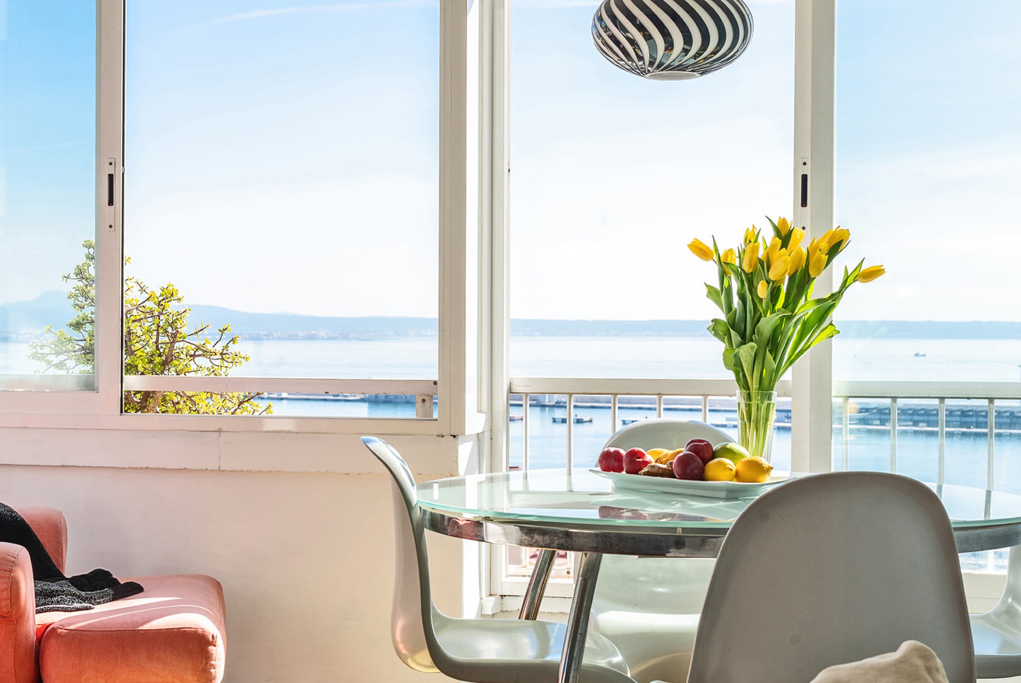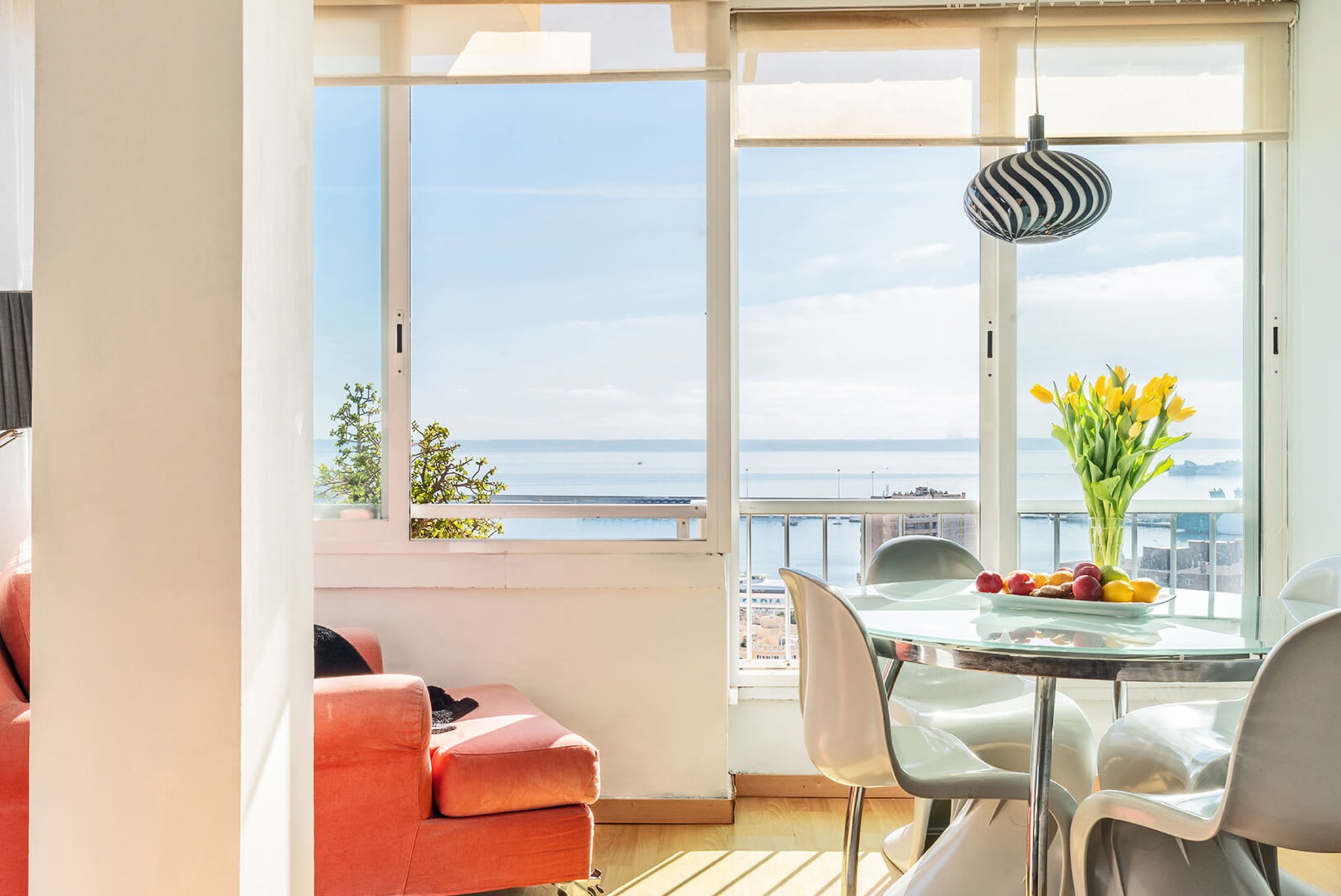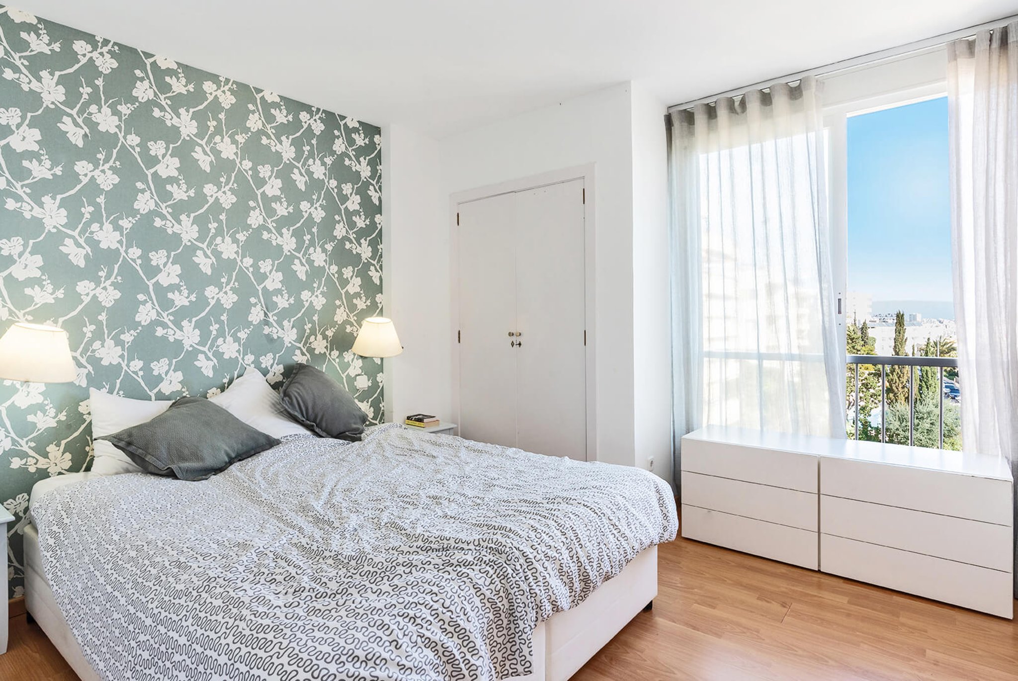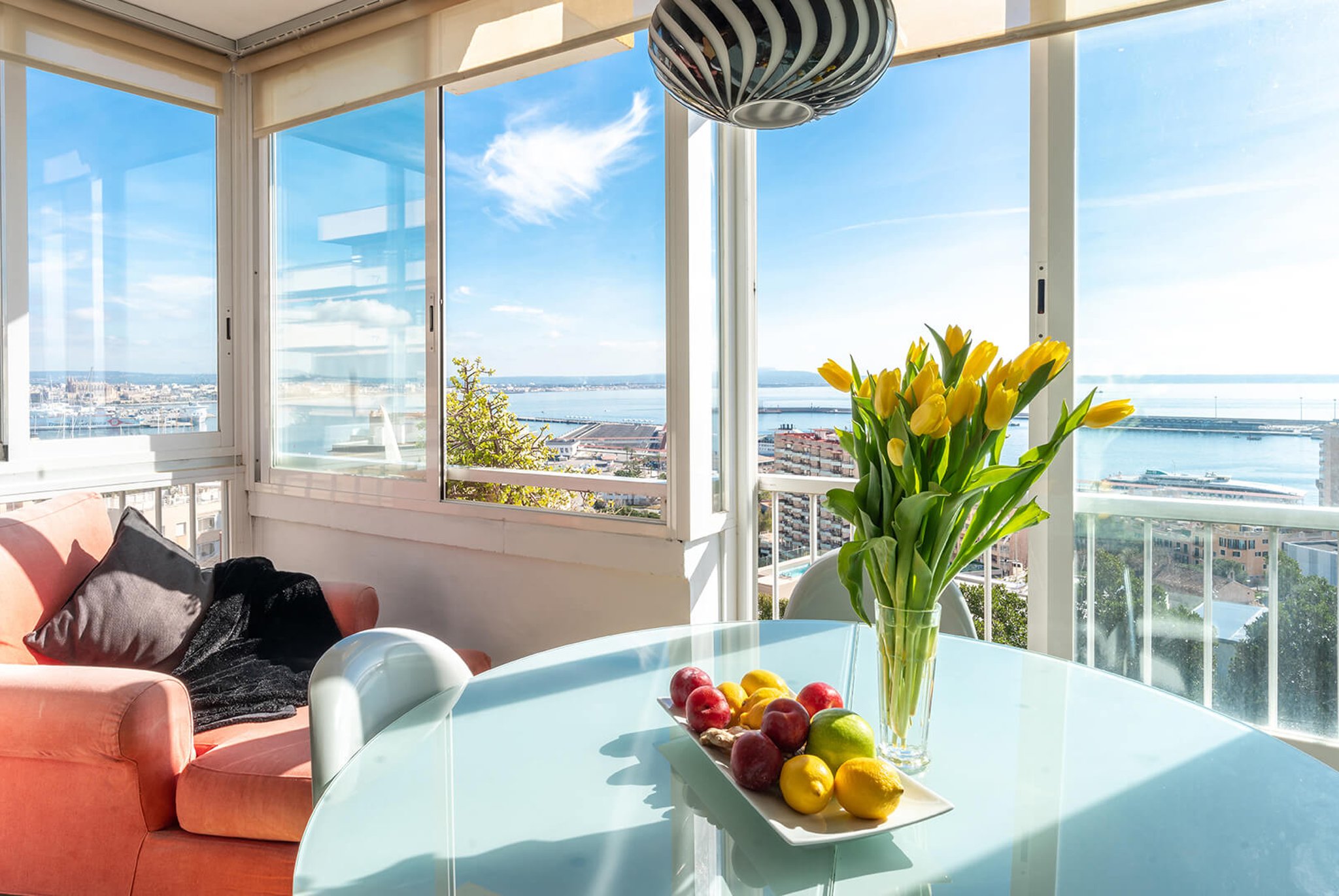 The property is located on the fifth floor in a building with communal pool and garden. The apartment has a total living area of 75 m2 with 2 bedrooms and 2 bathrooms. The open kitchen and living room area offers a breathtaking view over the Bay of Palma, the marina, the Cathedral and the sea. The apartment was renovated in 2010 and is very bright.