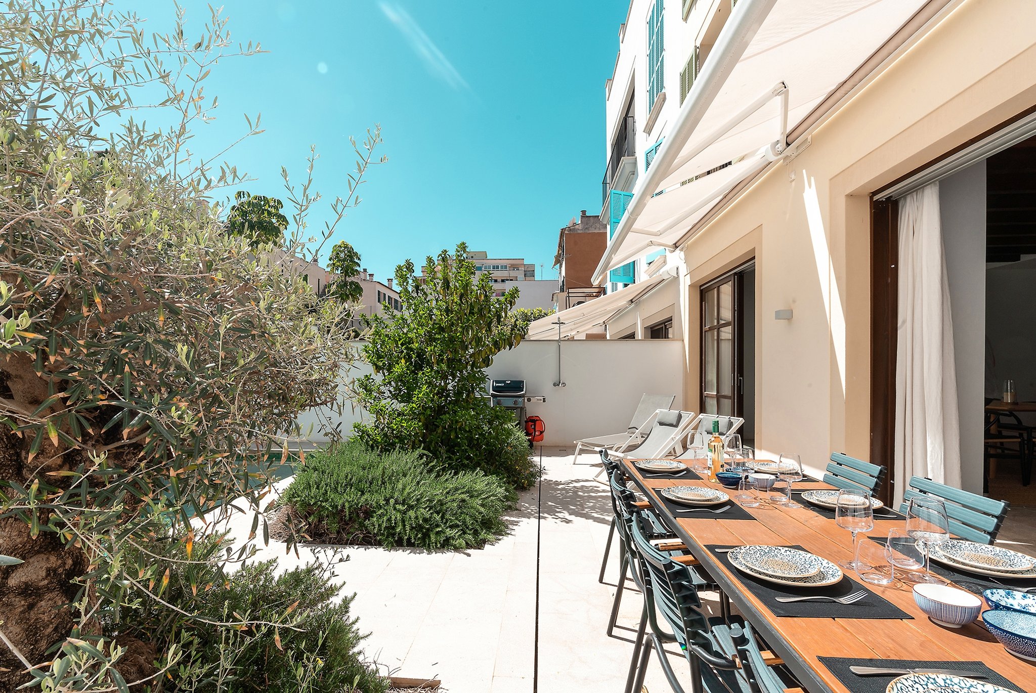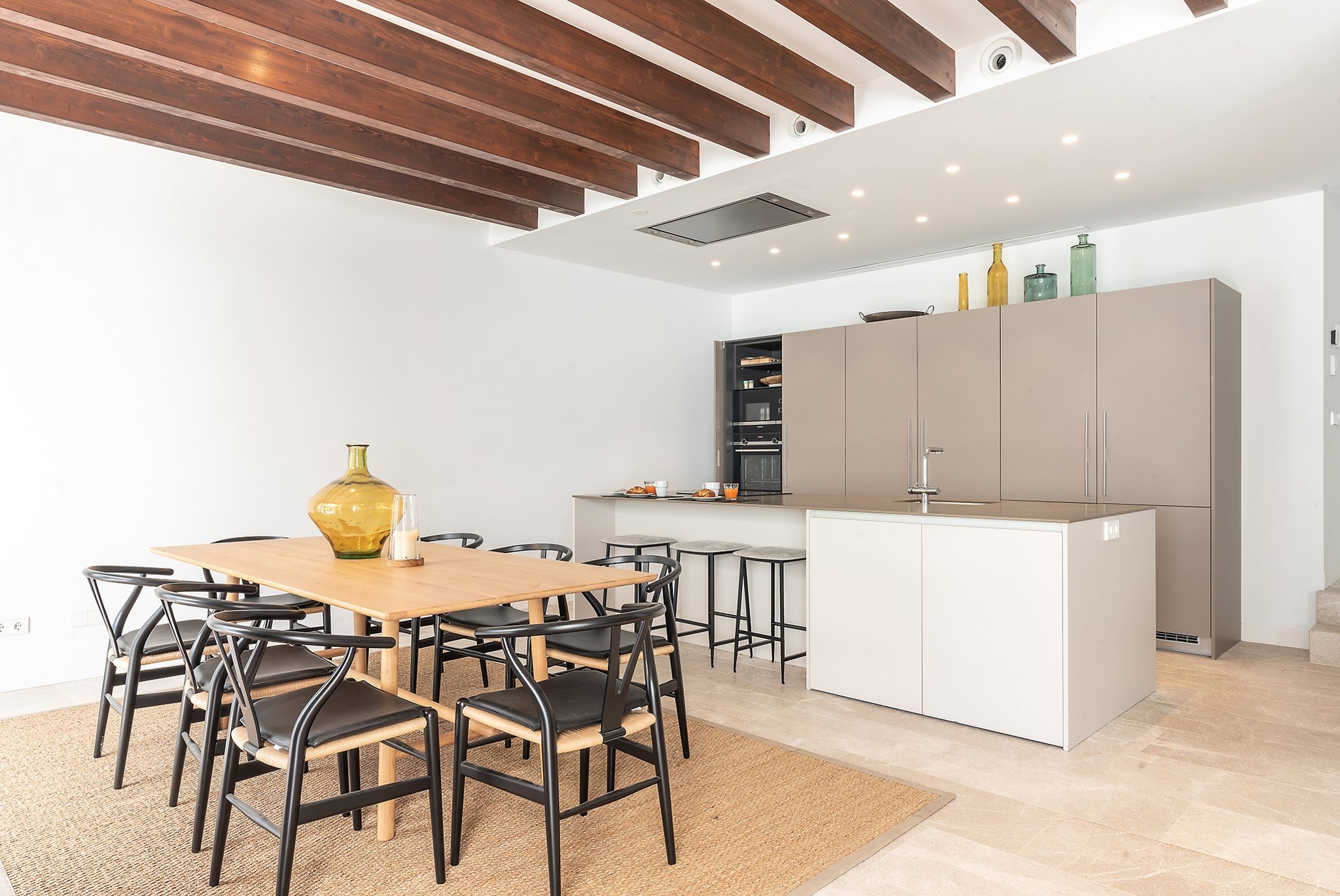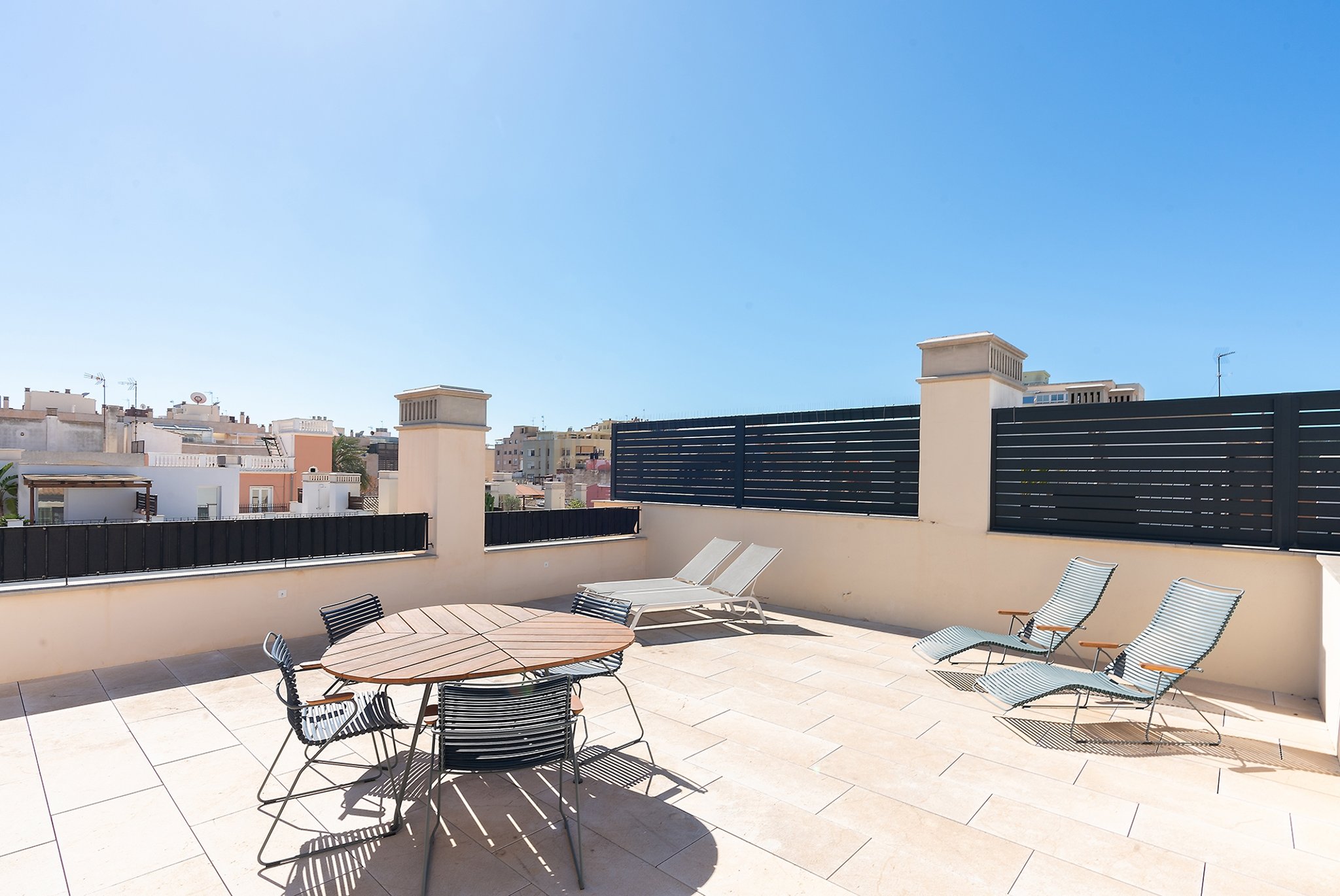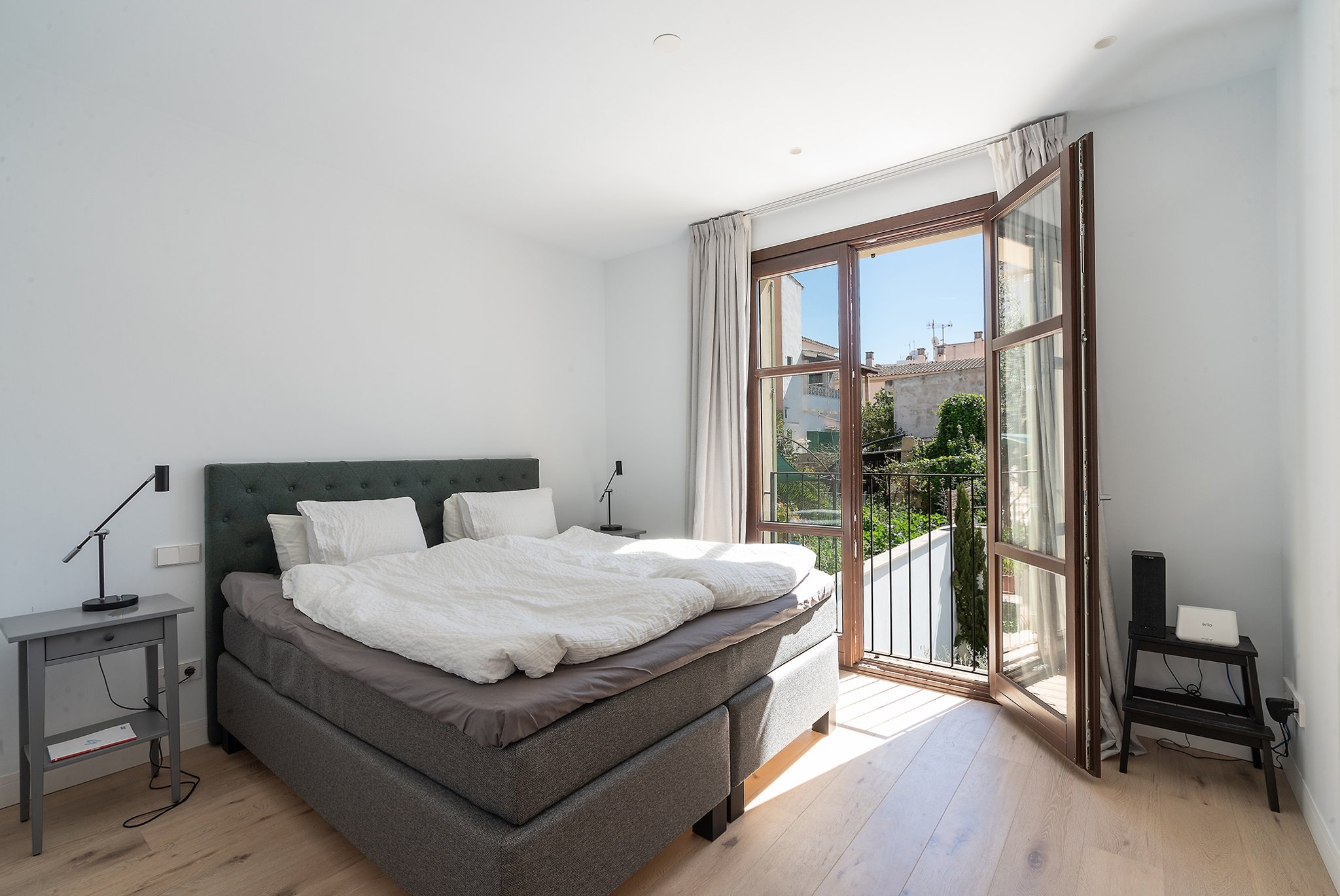 This practically brand new house is located on a quiet street in the sought after area of Son Espanyolet. The property boasts a living area of over 300 m2 plus more than 150 m2 of terraces spread on all three levels. The ground floor is a large open area incorporating the kitchen, dining area and living room. All of this opens up via large glass doors to the terrace and the pool area. This comfortable pool side terrace has been beautifully planned with lots of Mediterranean plants and space for both sunbathing alfresco dining. On the first floor, we find a nice entrance hall that we can access from both the street level and directly from the garage. Here we also find the master bedroom with its own en suite bathroom and dressing room. A staircase takes us up to the second floor with 4 additional bedrooms and 2 bathrooms. Last but not least, we find a 60 m2 roof terrace ideal for enjoying the sun all day long and the breeze of the summer nights. Throughout the house, careful consideration has been given to the palette of materials and finishes. The idea was to have a house with all modern commodities but preserve the Mediterranean architecture. We can feel the Mallorcan touch particular in its wooden beams, typical Spanish shutters and its traditional façade.
