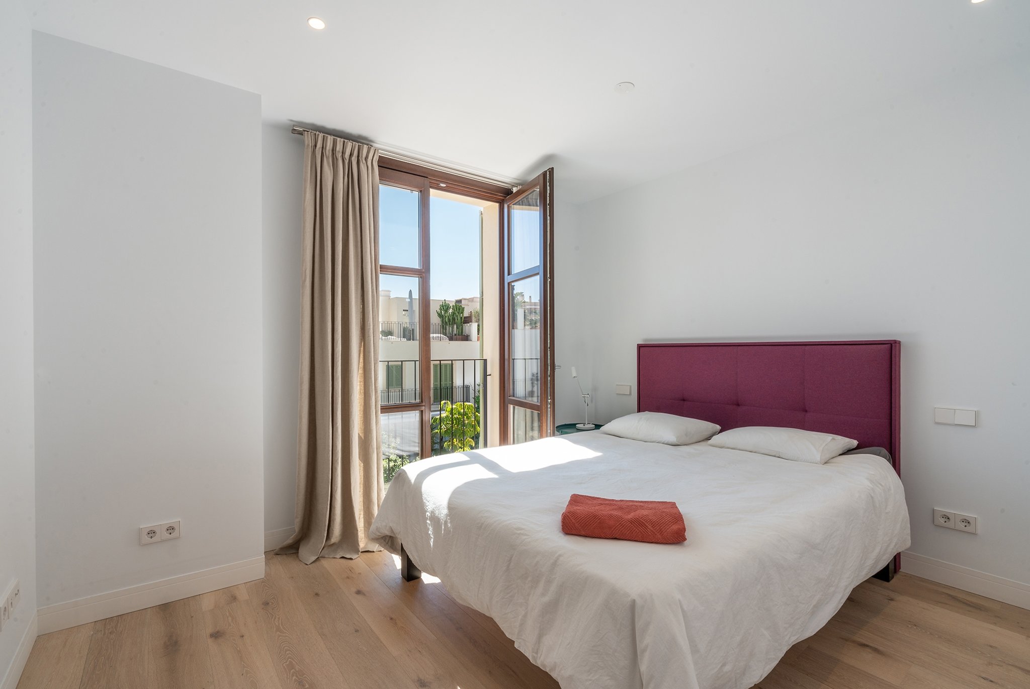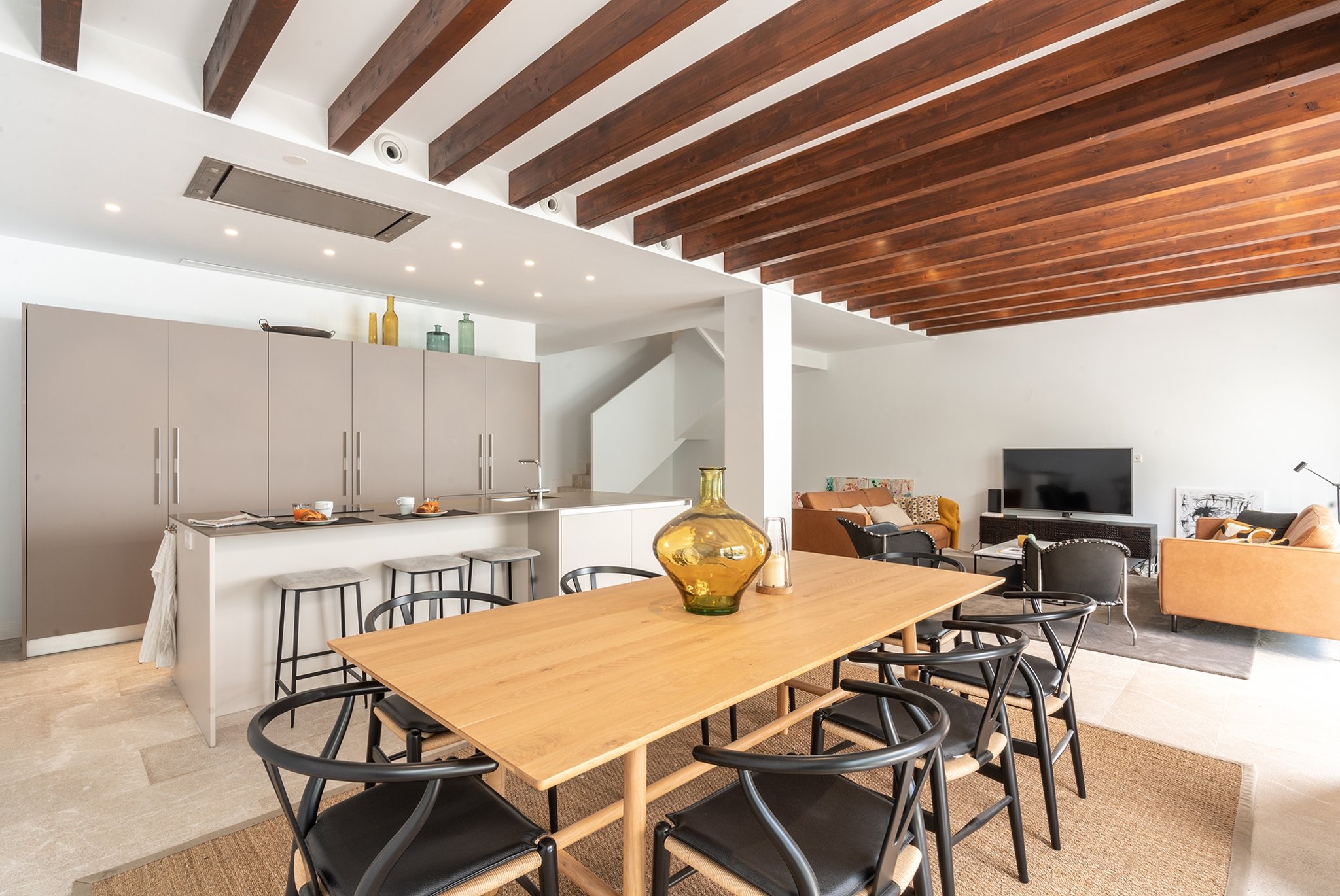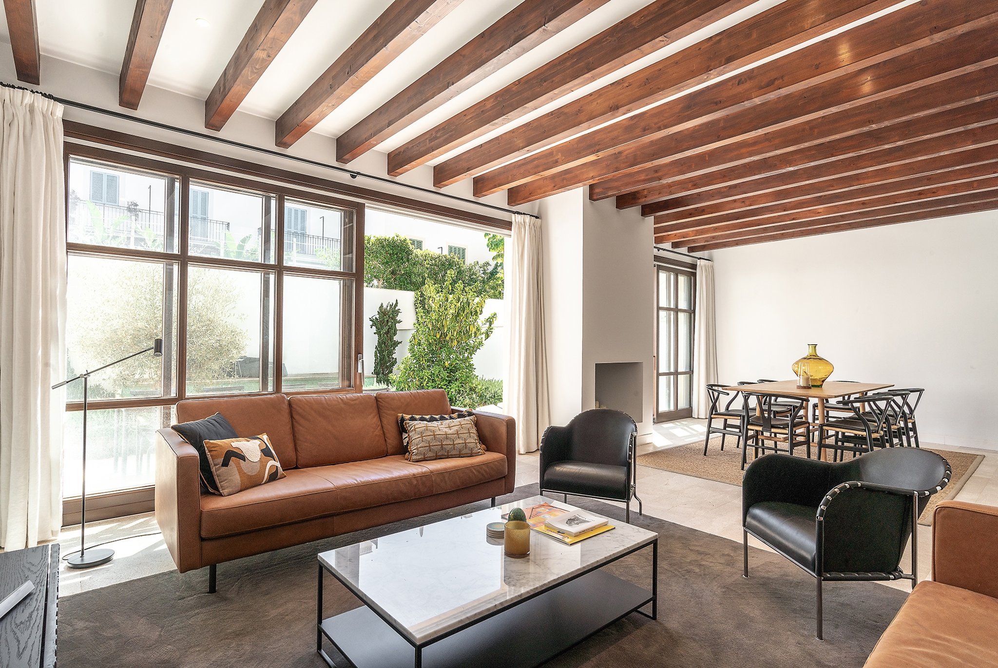 This practically brand new house is located on a quiet street in the sought after area of Son Espanyolet. The property boasts a living area of over 300 m2 plus more than 150 m2 of terraces spread on all three levels. The ground floor is a large open area incorporating the kitchen, dining area and living room. All of this opens up via large glass doors to the terrace and the pool area. This comfortable pool side terrace has been beautifully planned with lots of Mediterranean plants and space for both sunbathing alfresco dining. On the first floor, we find a nice entrance hall that we can access from both the street level and directly from the garage. Here we also find the master bedroom with its own en suite bathroom and dressing room. A staircase takes us up to the second floor with 4 additional bedrooms and 2 bathrooms. Last but not least, we find a 60 m2 roof terrace ideal for enjoying the sun all day long and the breeze of the summer nights. Throughout the house, careful consideration has been given to the palette of materials and finishes. The idea was to have a house with all modern commodities but preserve the Mediterranean architecture. We can feel the Mallorcan touch particular in its wooden beams, typical Spanish shutters and its traditional façade.