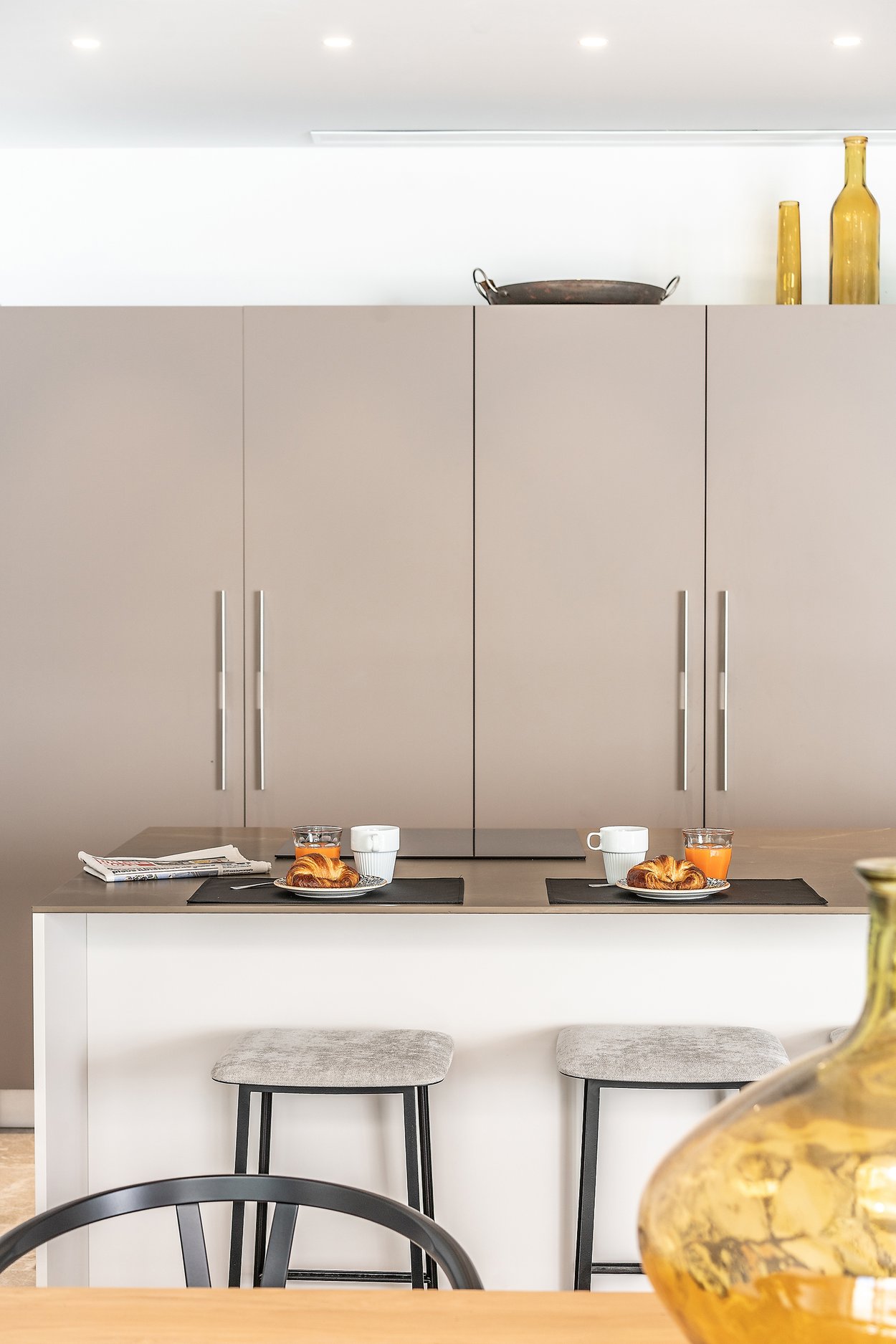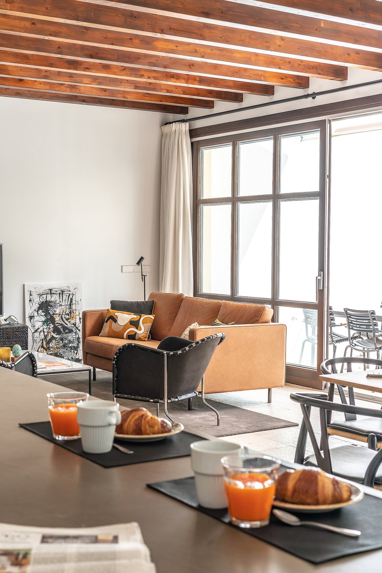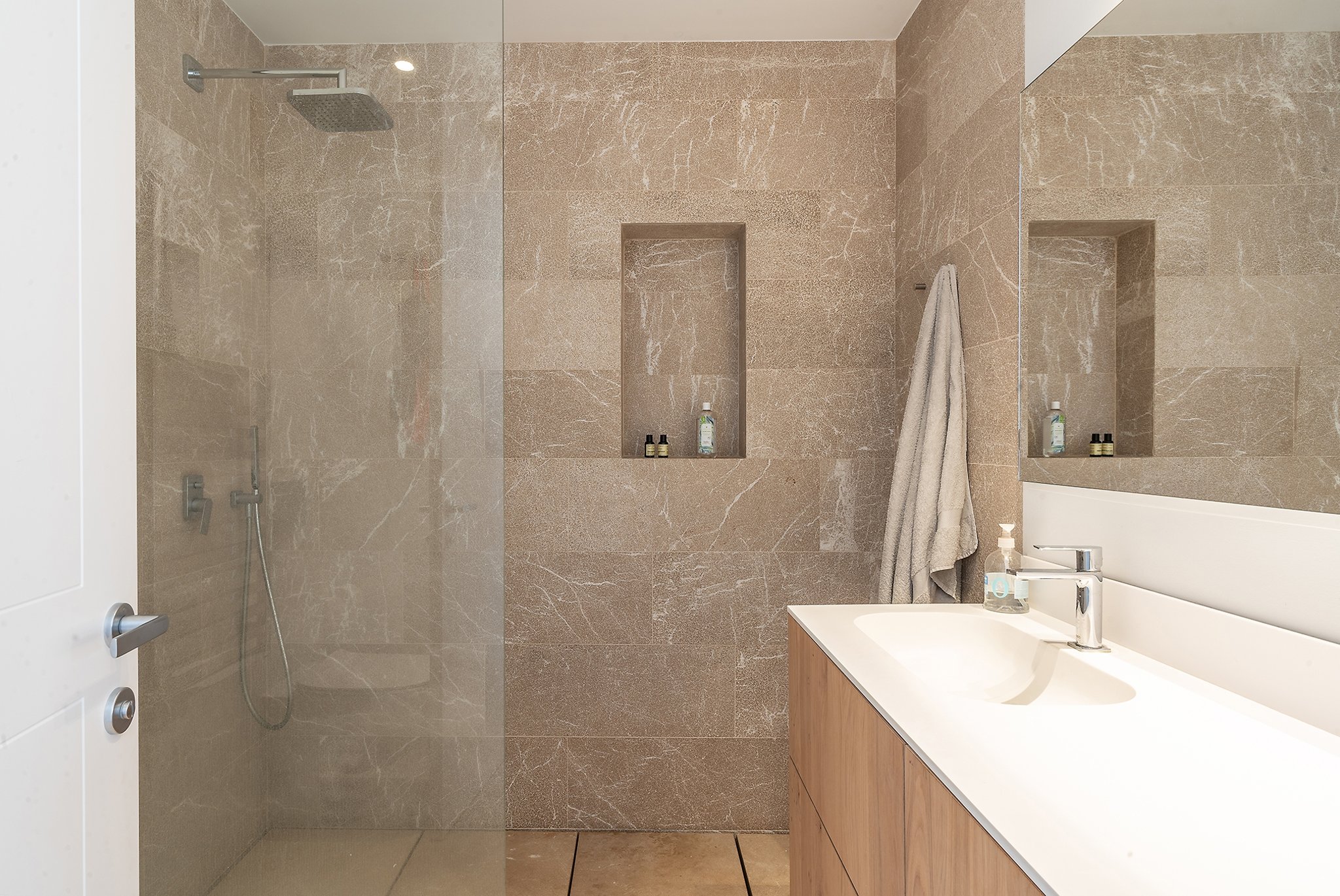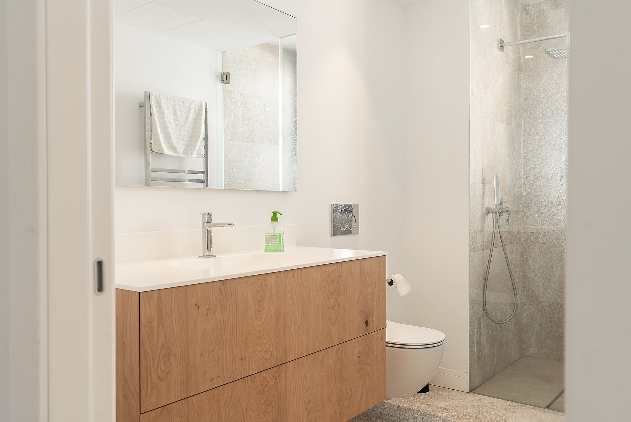 This practically brand new house is located on a quiet street in the sought after area of Son Espanyolet. The property boasts a living area of over 300 m2 plus more than 150 m2 of terraces spread on all three levels. The ground floor is a large open area incorporating the kitchen, dining area and living room. All of this opens up via large glass doors to the terrace and the pool area. This comfortable pool side terrace has been beautifully planned with lots of Mediterranean plants and space for both sunbathing alfresco dining. On the first floor, we find a nice entrance hall that we can access from both the street level and directly from the garage. Here we also find the master bedroom with its own en suite bathroom and dressing room. A staircase takes us up to the second floor with 4 additional bedrooms and 2 bathrooms. Last but not least, we find a 60 m2 roof terrace ideal for enjoying the sun all day long and the breeze of the summer nights. Throughout the house, careful consideration has been given to the palette of materials and finishes. The idea was to have a house with all modern commodities but preserve the Mediterranean architecture. We can feel the Mallorcan touch particular in its wooden beams, typical Spanish shutters and its traditional façade.
