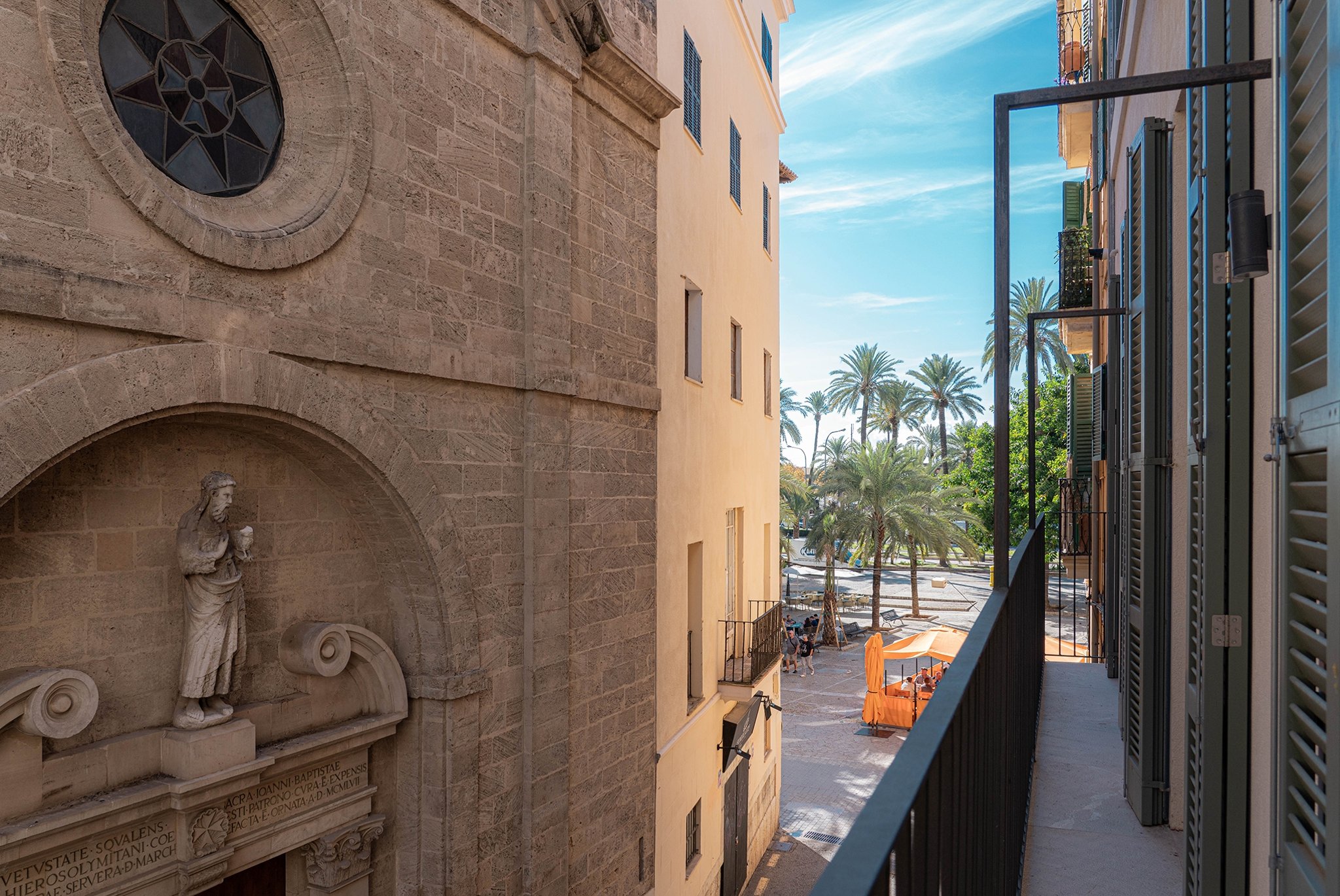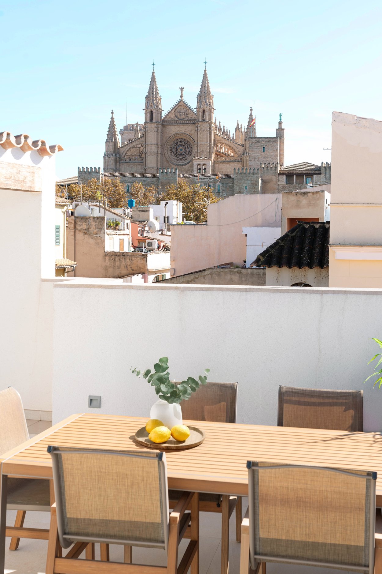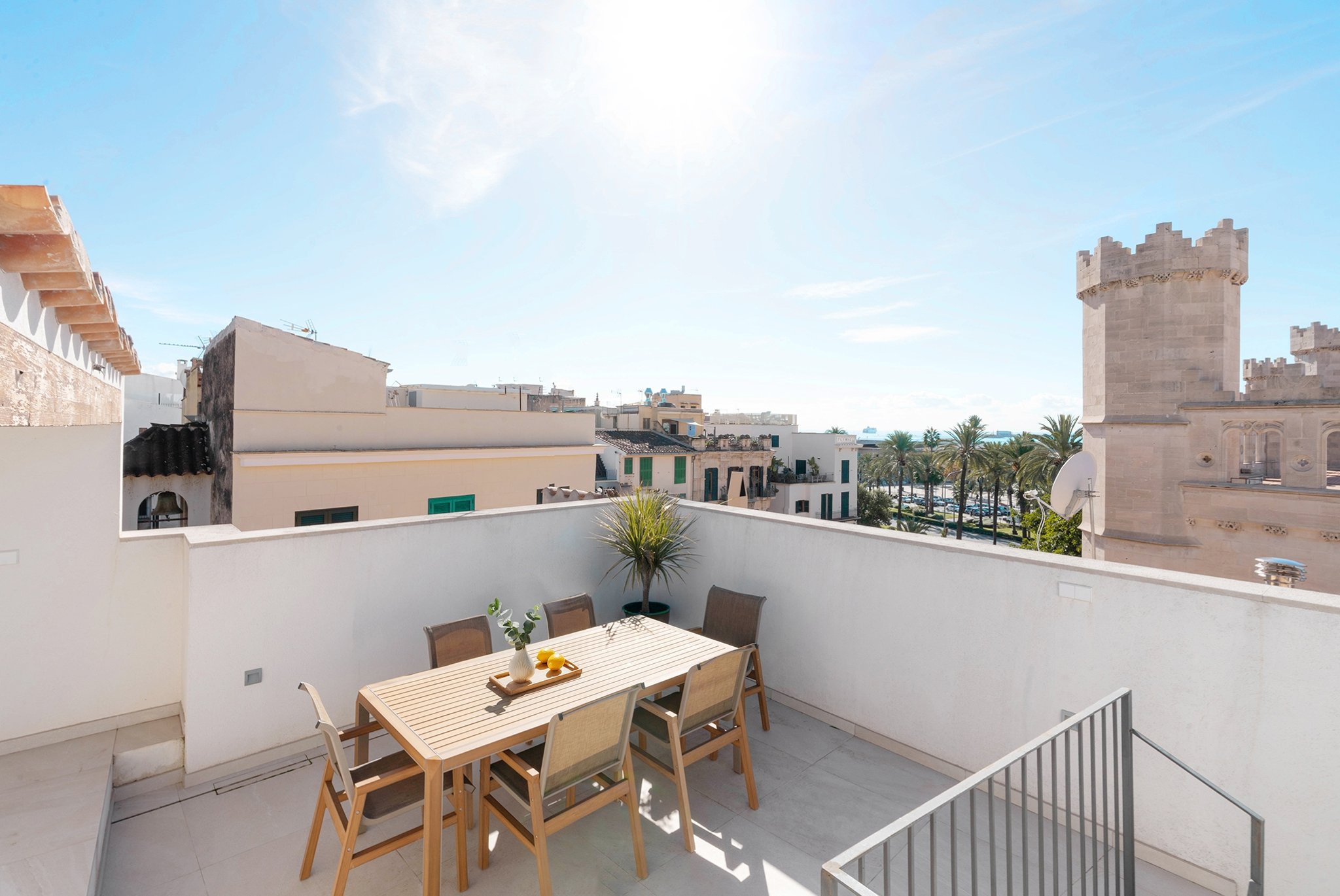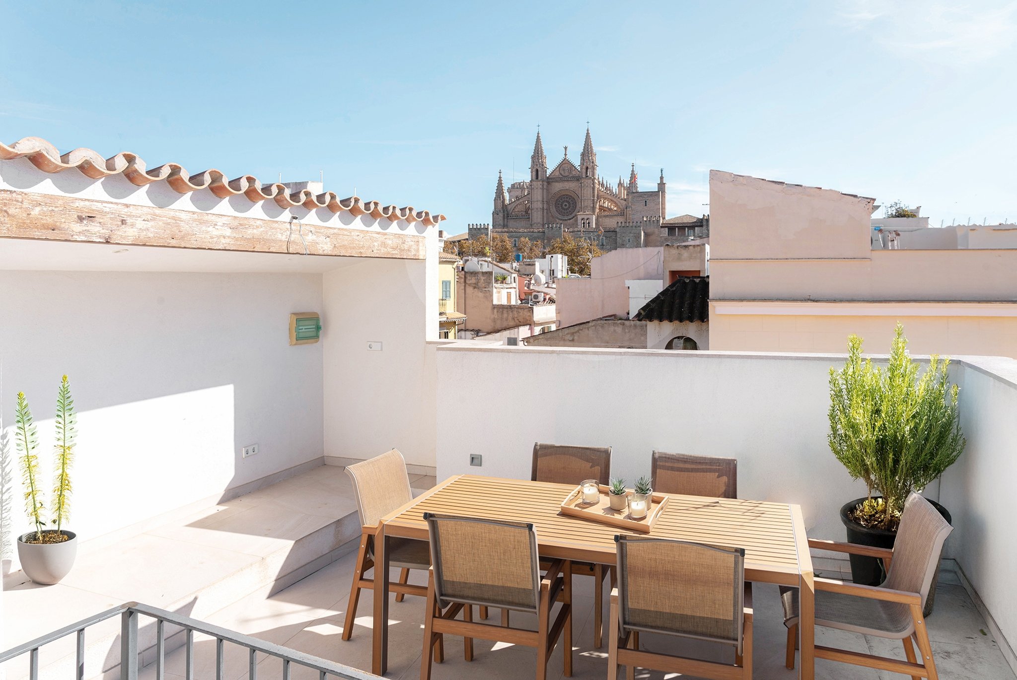 A lounge leads up to the private 40 m² rooftop terrace, where you can enjoy sun all day, space for outdoor cooking, relaxation, and stunning views of the cathedral and Palma Bay.