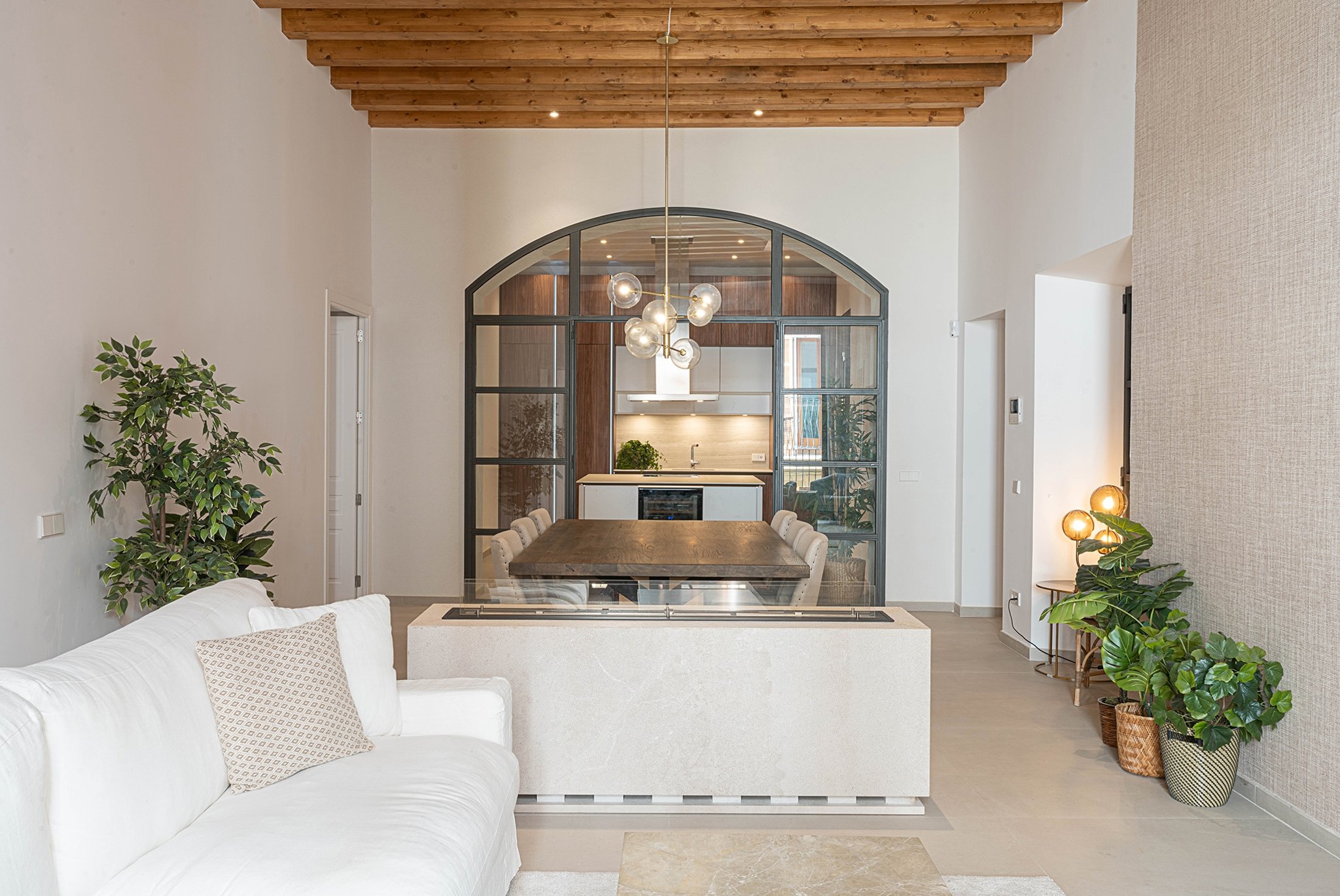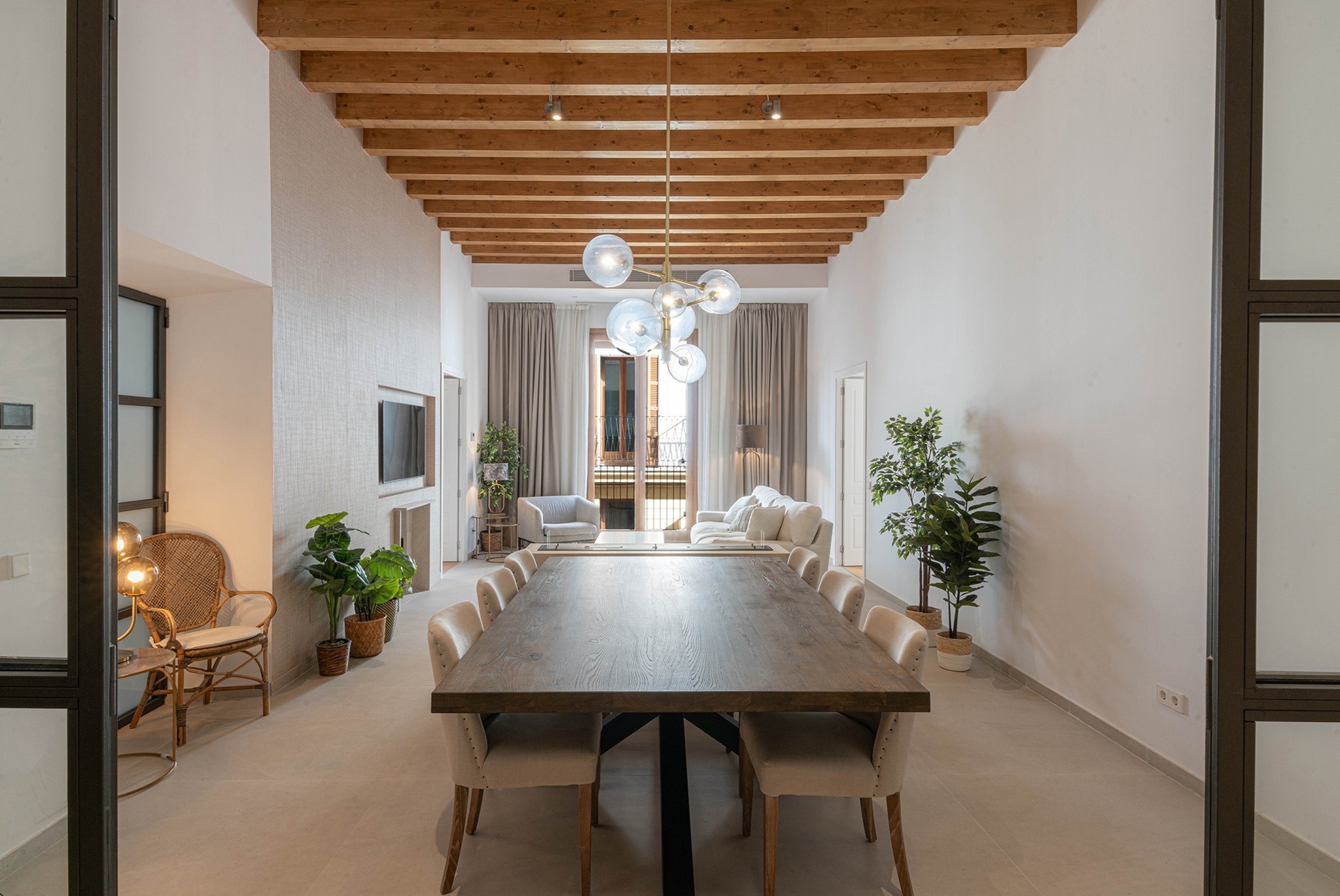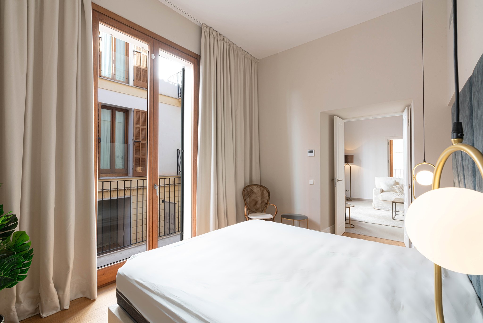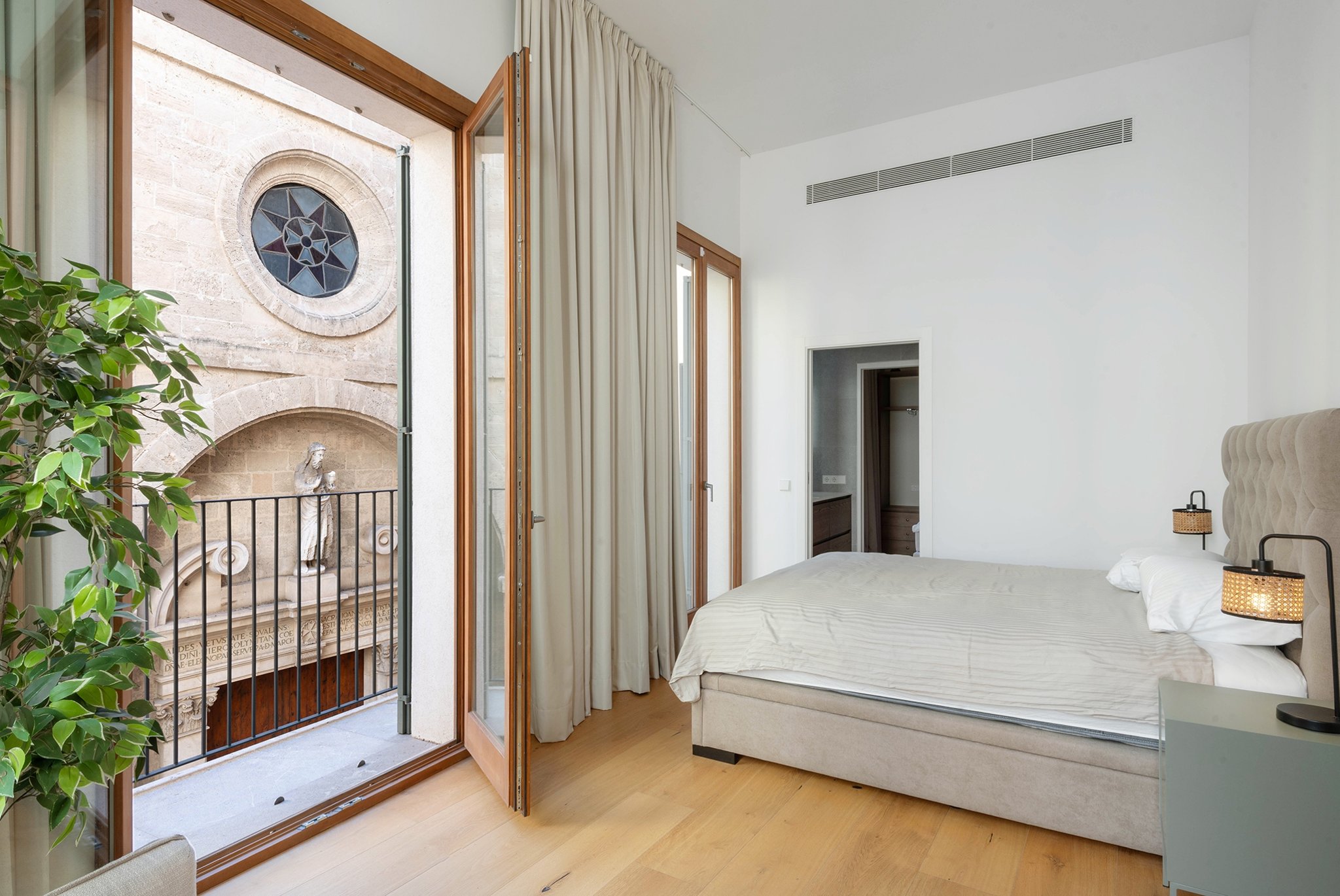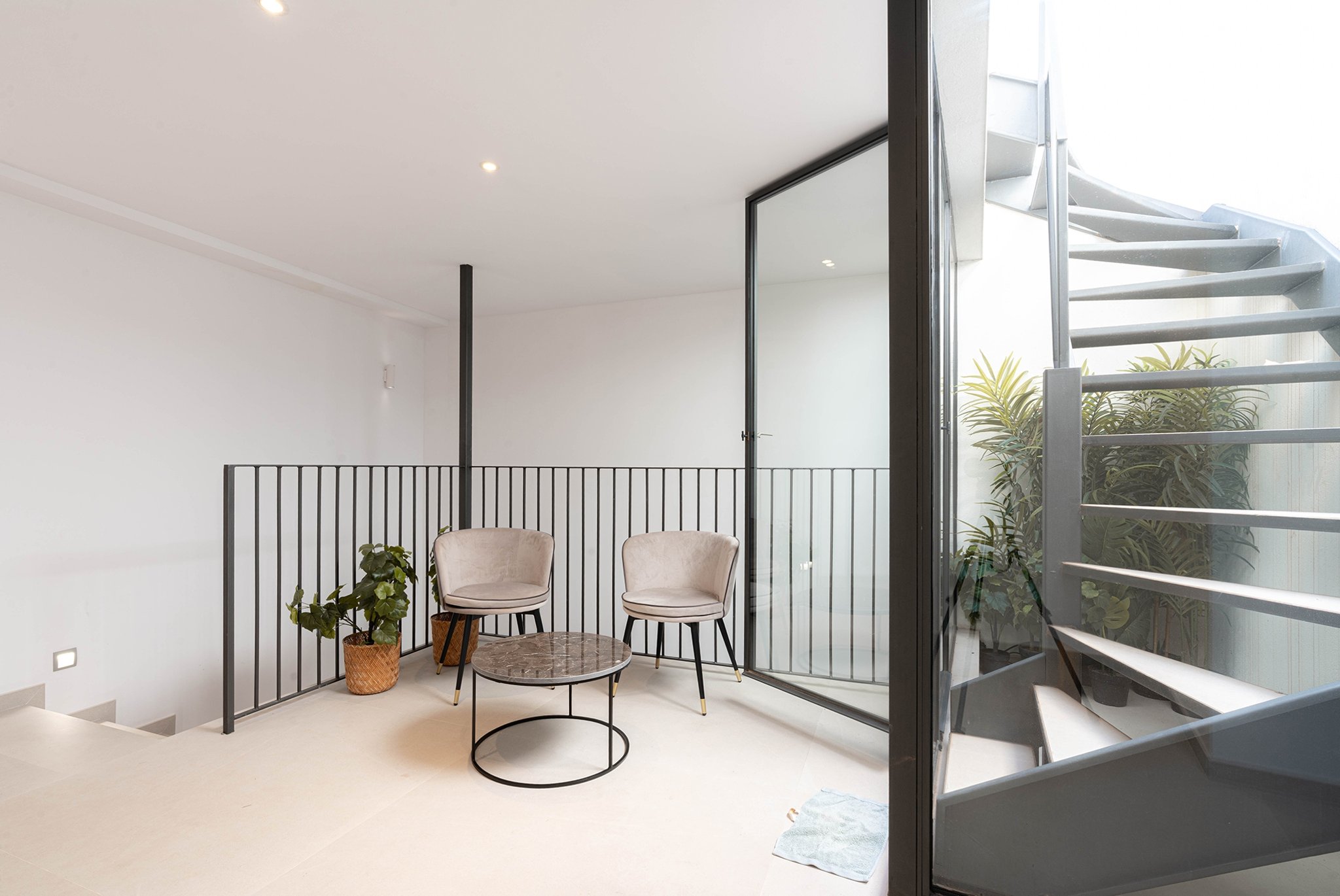 A lounge leads up to the private 40 m² rooftop terrace, where you can enjoy sun all day, space for outdoor cooking, relaxation, and stunning views of the cathedral and Palma Bay.