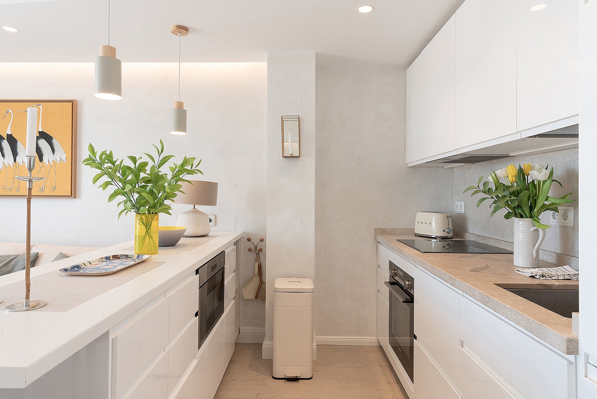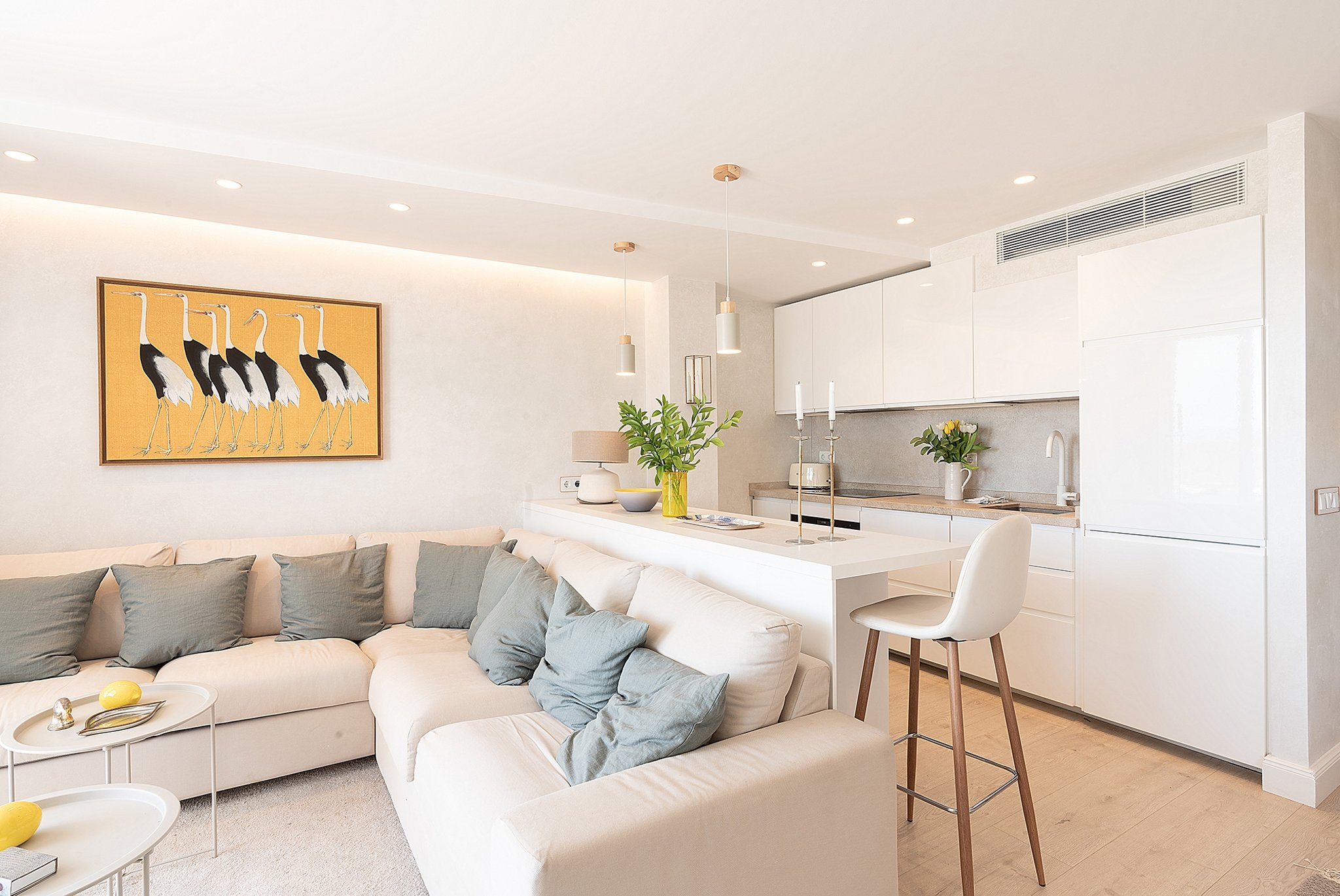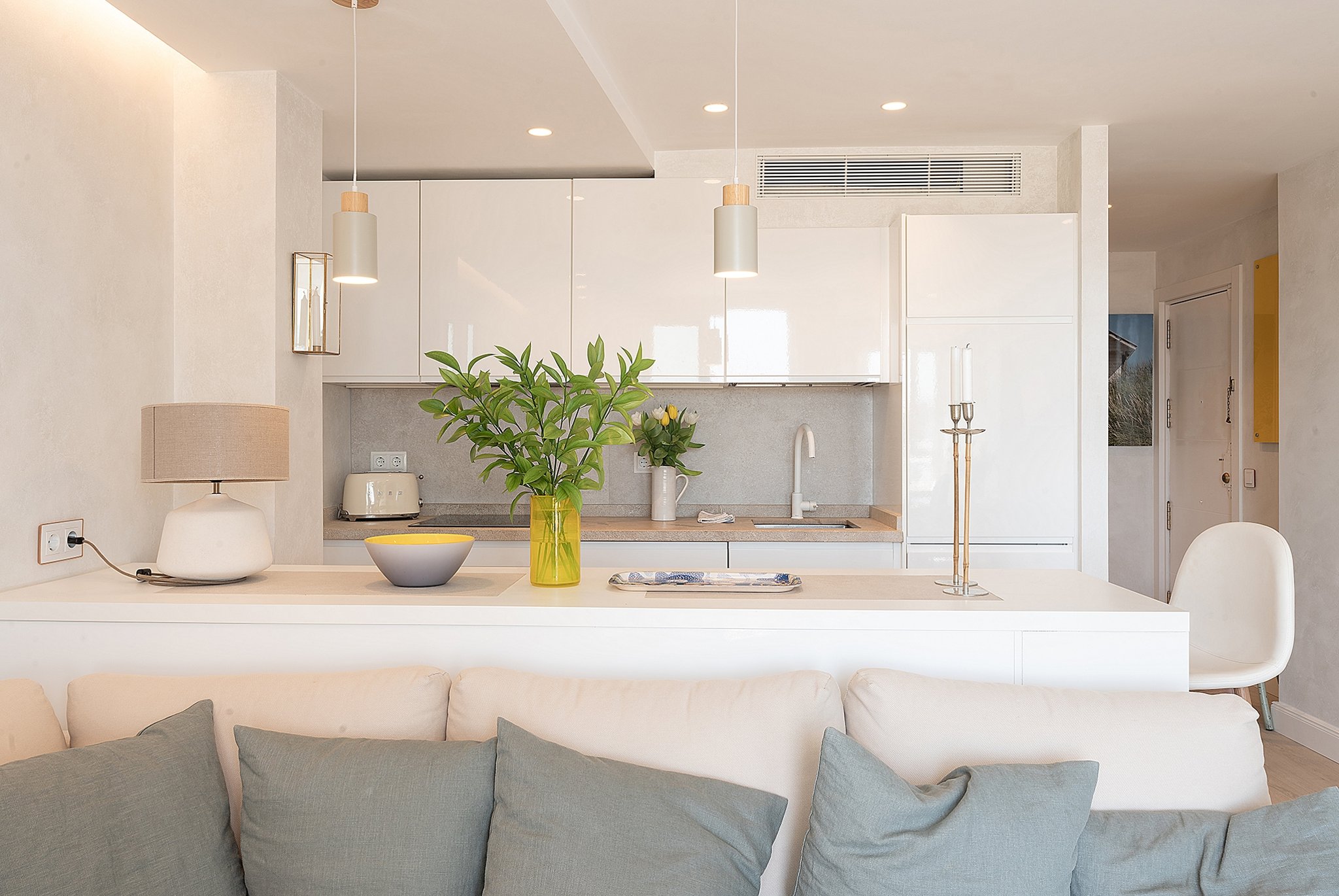The flat was recently renovated and is decorated with furniture in beautiful and bright colors. The bathrooms have underfloor heating and heated towel rails, and all rooms have built-in hot and cold air conditioning. The apartment welcomes you with a small hall with good storage and directly adjacent is a complete bathroom. Kitchen and living room have an open floor plan with direct access to the efficiently utilized terrace with a built-in bench. Both bedrooms have plenty of space for a double bed and there is also ample wardrobe space. The master bedroom has a bathroom en-suite. Since the apartment is sold with the furniture included, you just need to turn the key and move in!