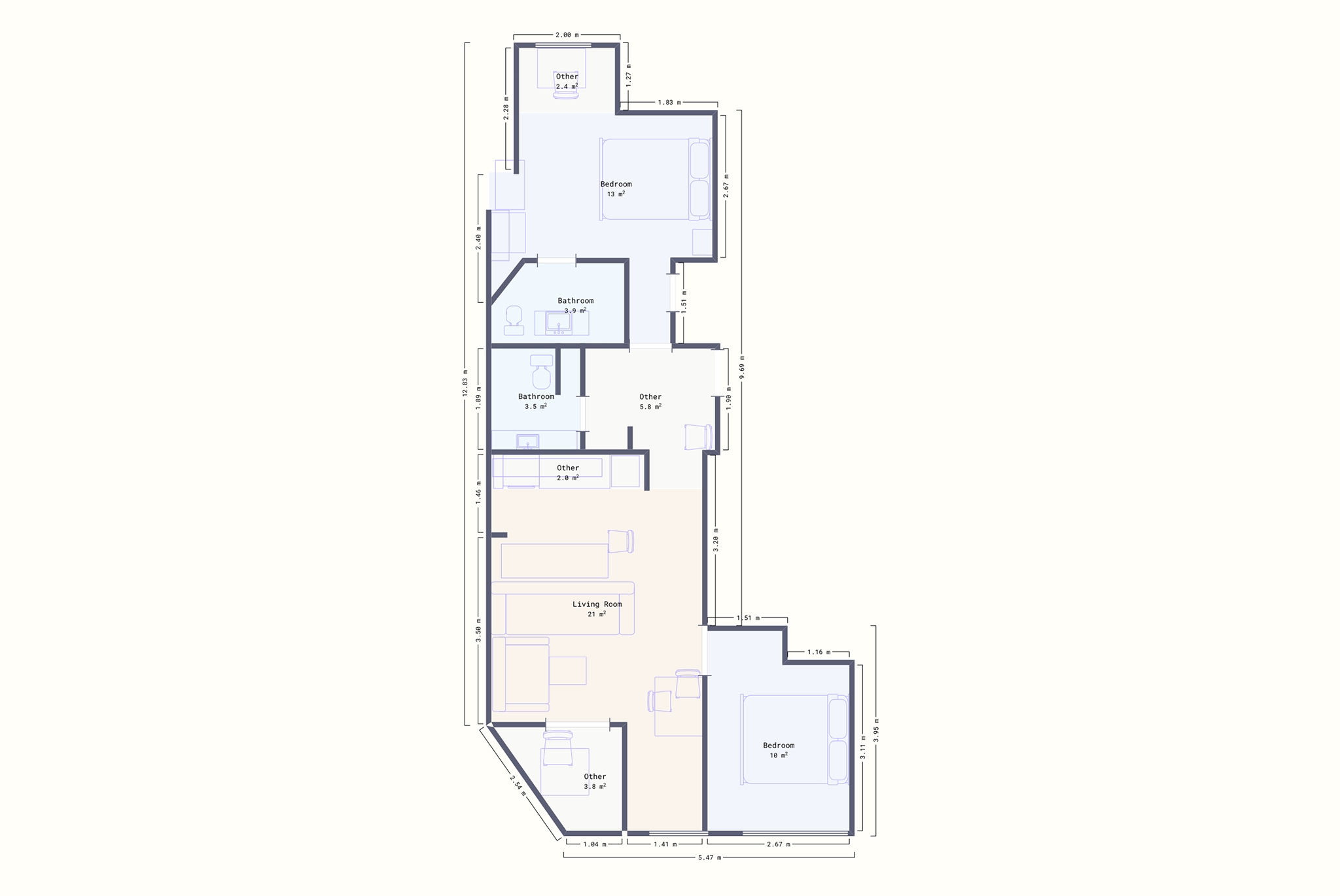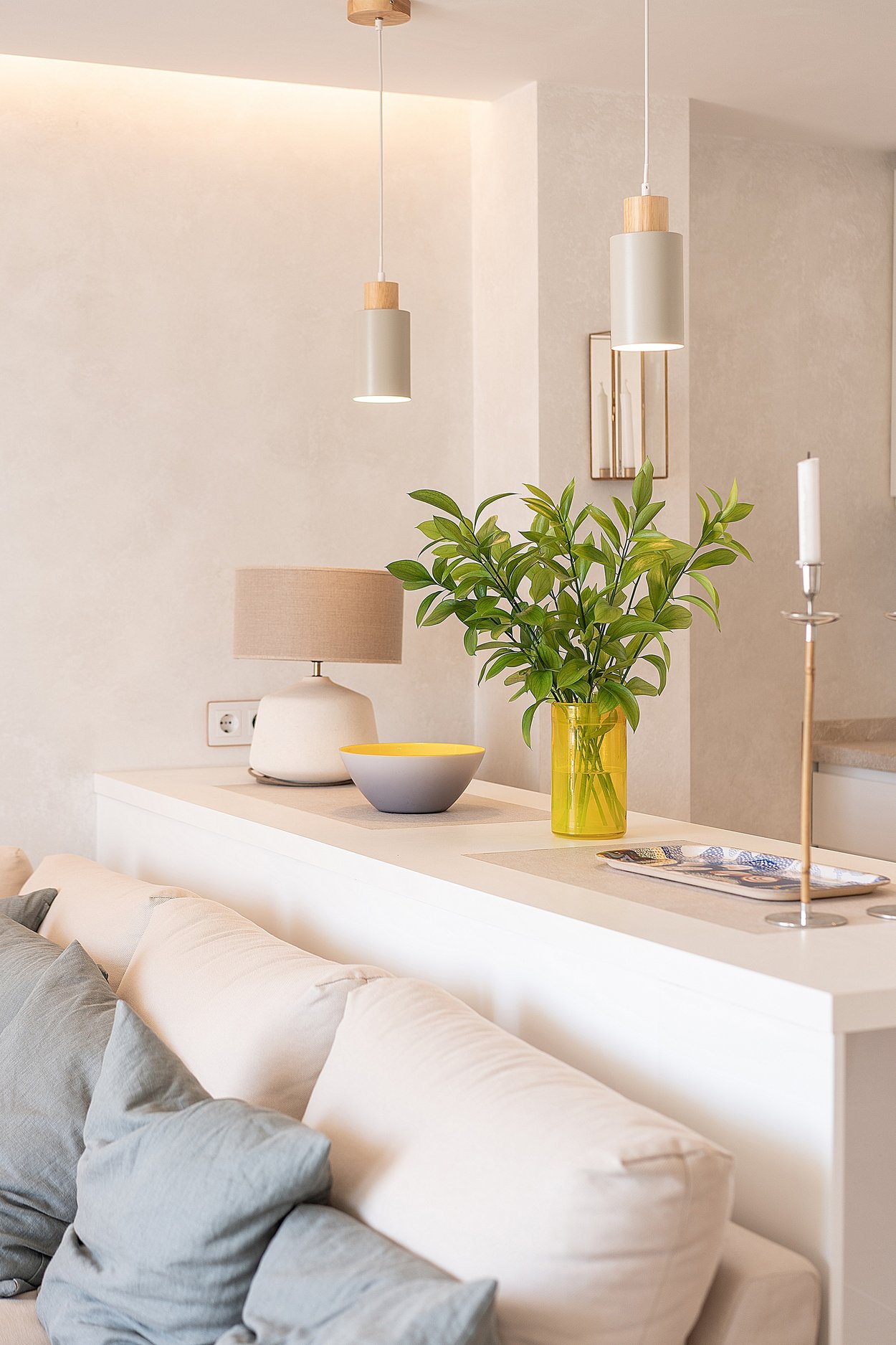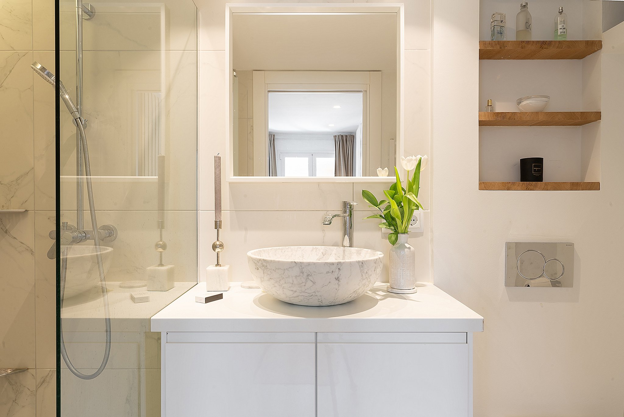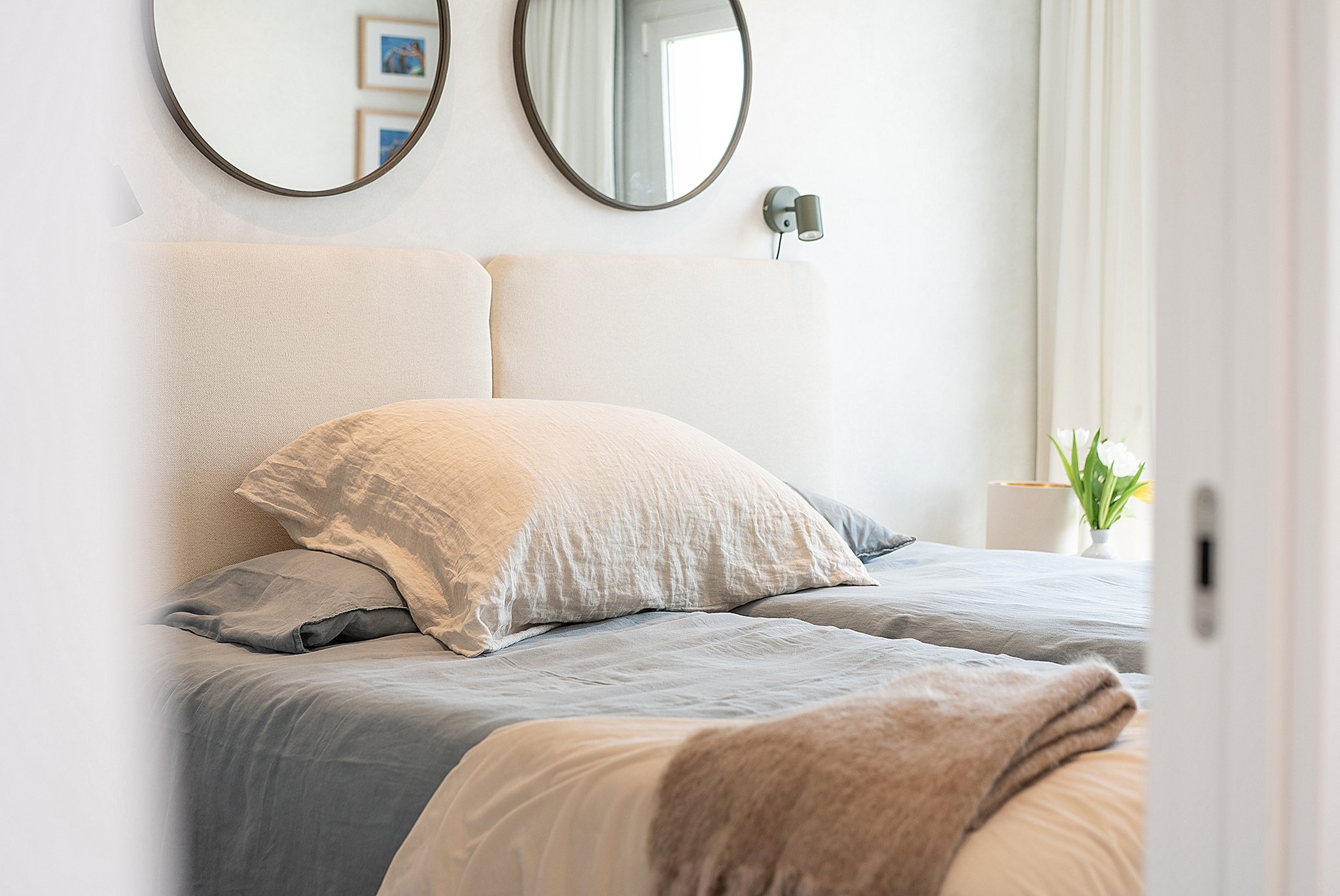 The flat was recently renovated and is decorated with furniture in beautiful and bright colors. The bathrooms have underfloor heating and heated towel rails, and all rooms have built-in hot and cold air conditioning. The apartment welcomes you with a small hall with good storage and directly adjacent is a complete bathroom. Kitchen and living room have an open floor plan with direct access to the efficiently utilized terrace with a built-in bench. Both bedrooms have plenty of space for a double bed and there is also ample wardrobe space. The master bedroom has a bathroom en-suite. Since the apartment is sold with the furniture included, you just need to turn the key and move in!