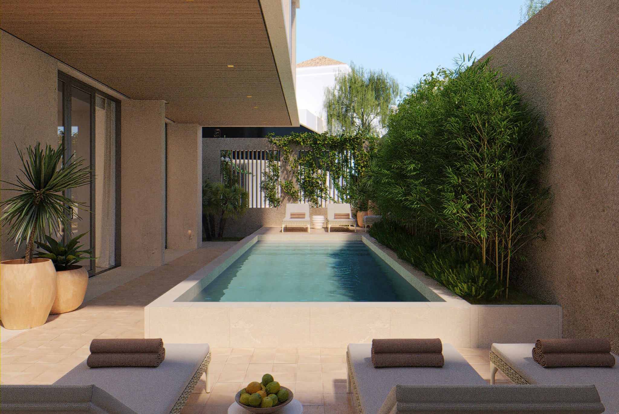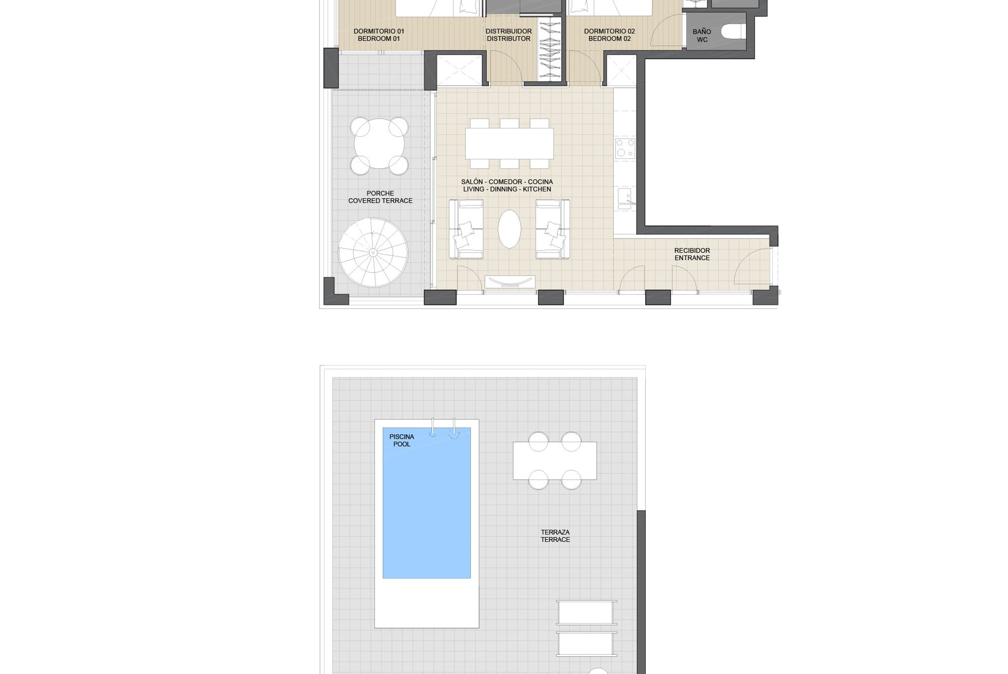 This exclusive penthouse has a total area of 160 m², of which 74 m² is living space and the remaining 86 m² consists of covered and open terraces. The apartment offers 2 bedrooms with en-suite bathrooms and a spacious, open-plan living room with kitchen. From the living room you reach a 14 m² west-facing terrace. A staircase leads up to the generous 73 m² roof terrace, which includes a private pool, sun terrace and green areas. Two covered parking spaces and a storage room are included in the price.