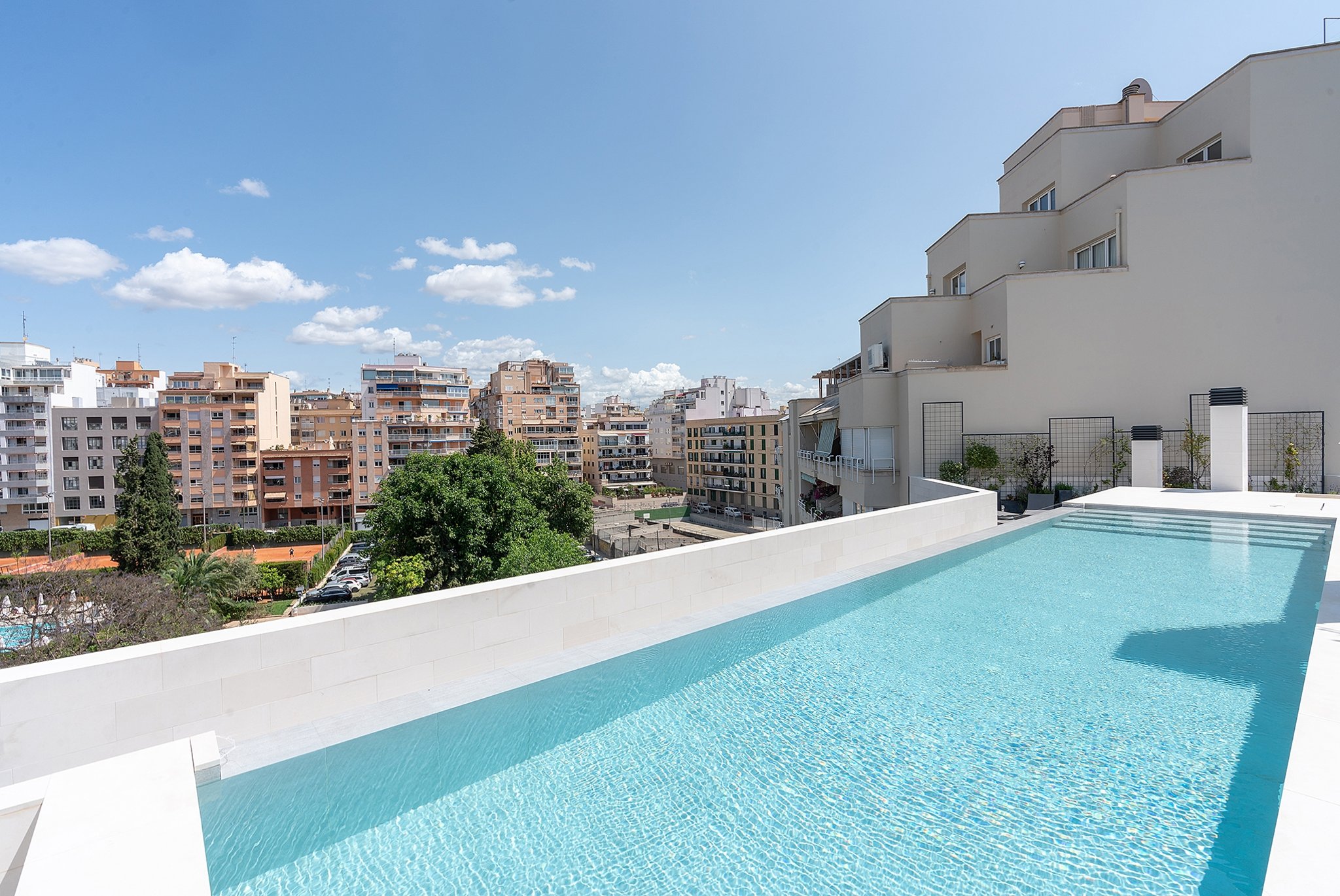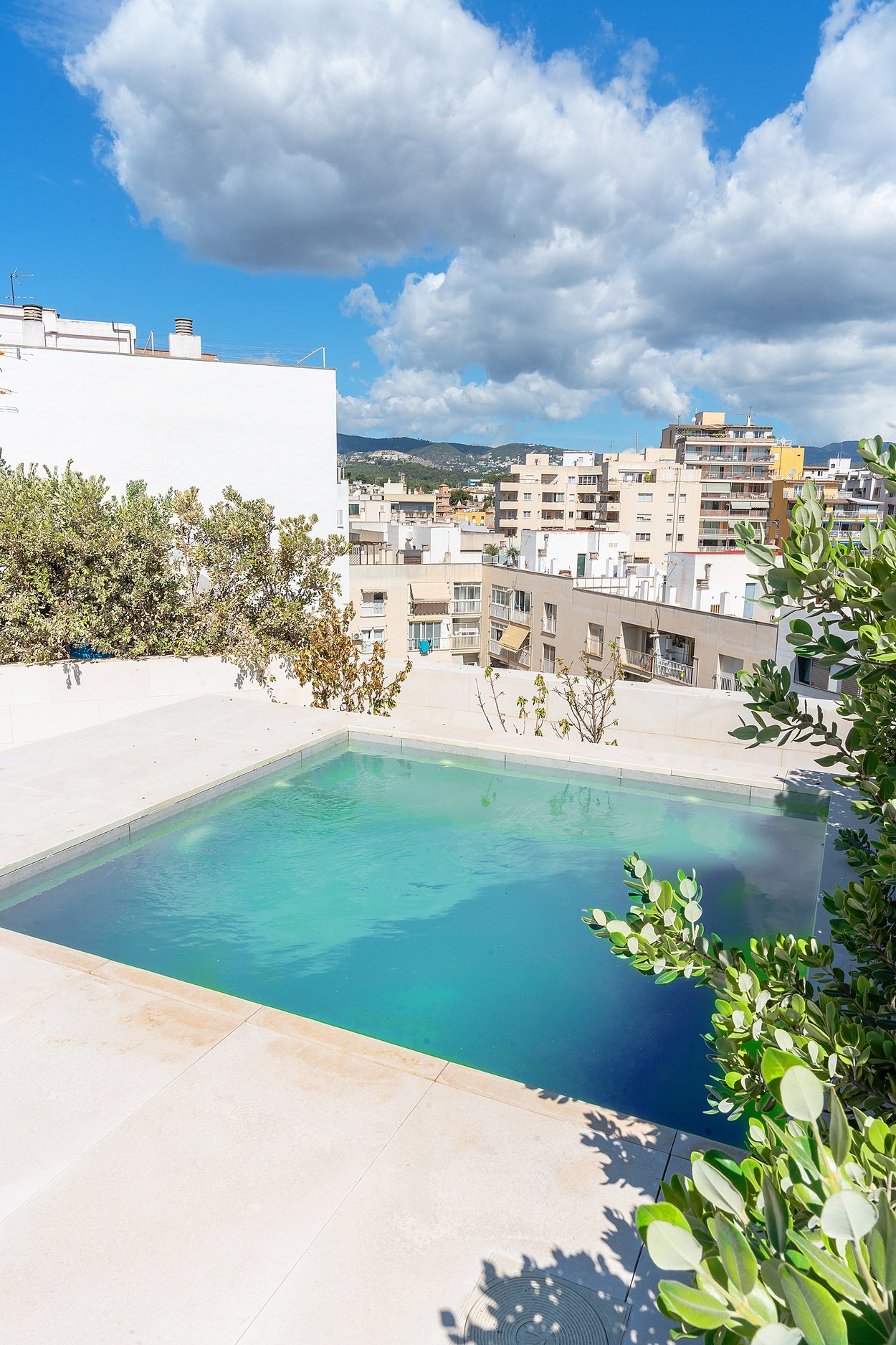 This luxury penthouse with a huge rooftop terrace overlooks Santa Catalina and Palma Tennis. It's ideal location means that is it is walking distance both to the sea side and the city center. This penthouse has 3 bedrooms and 2 bathrooms, one which is en suite. All bedrooms have built in wardrobes. The living room and the fully equipped kitchen have direct access to a terrace on the same level. From the terrace there is a staircase which leads you to the luxuruous rooftop terrace with its own private plunge pool and lounge area. The total living area is 97 m2 plus a total terrace area of 95 m2. The property also includes two underground and a storage room, and the building has an additionalroof top community pool.
