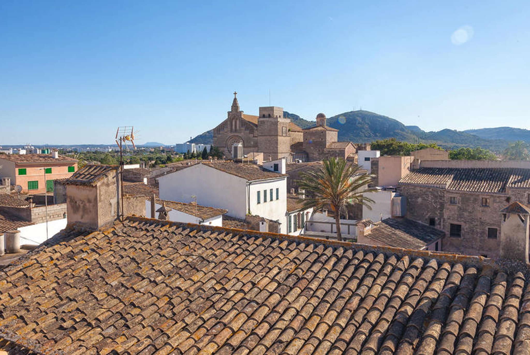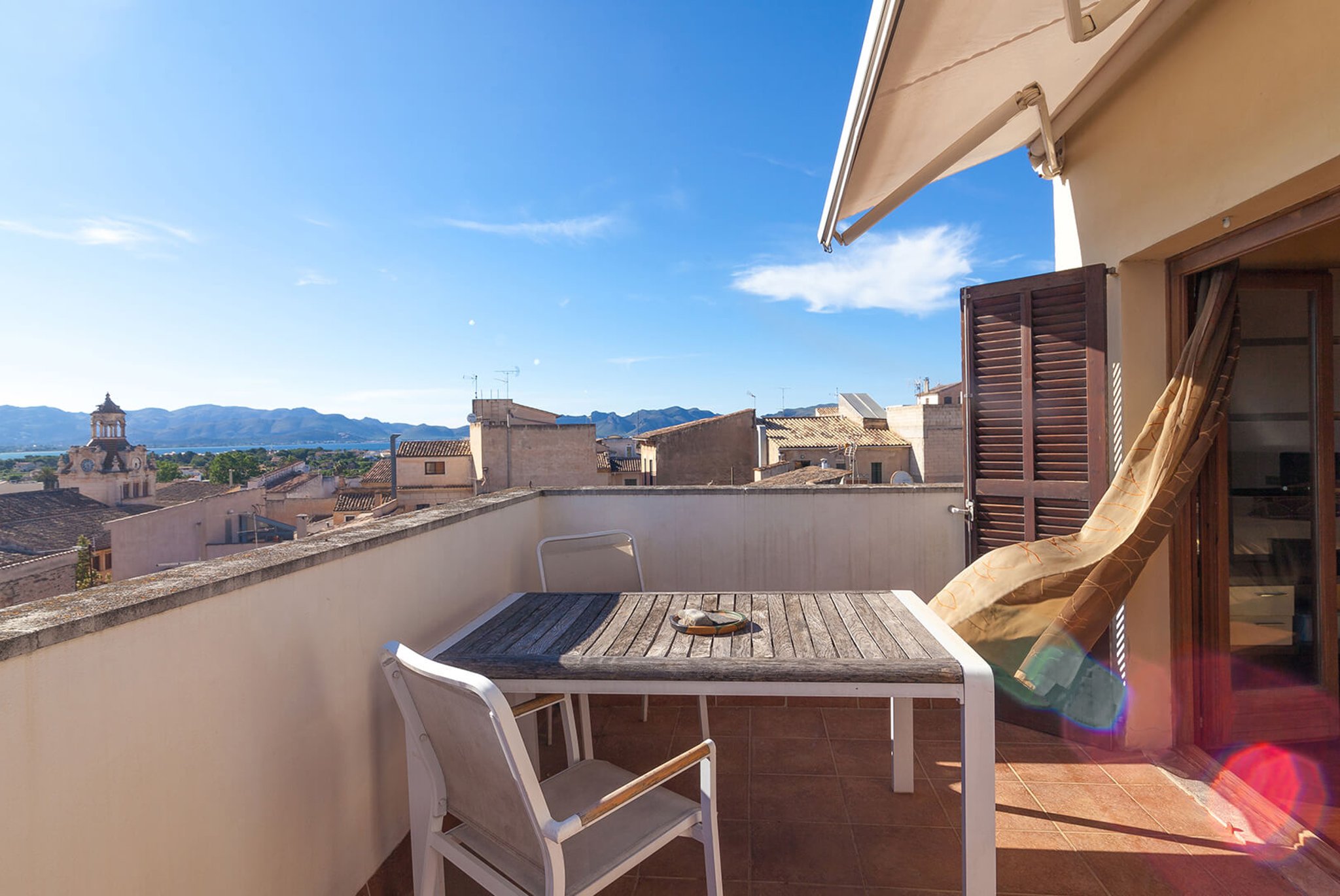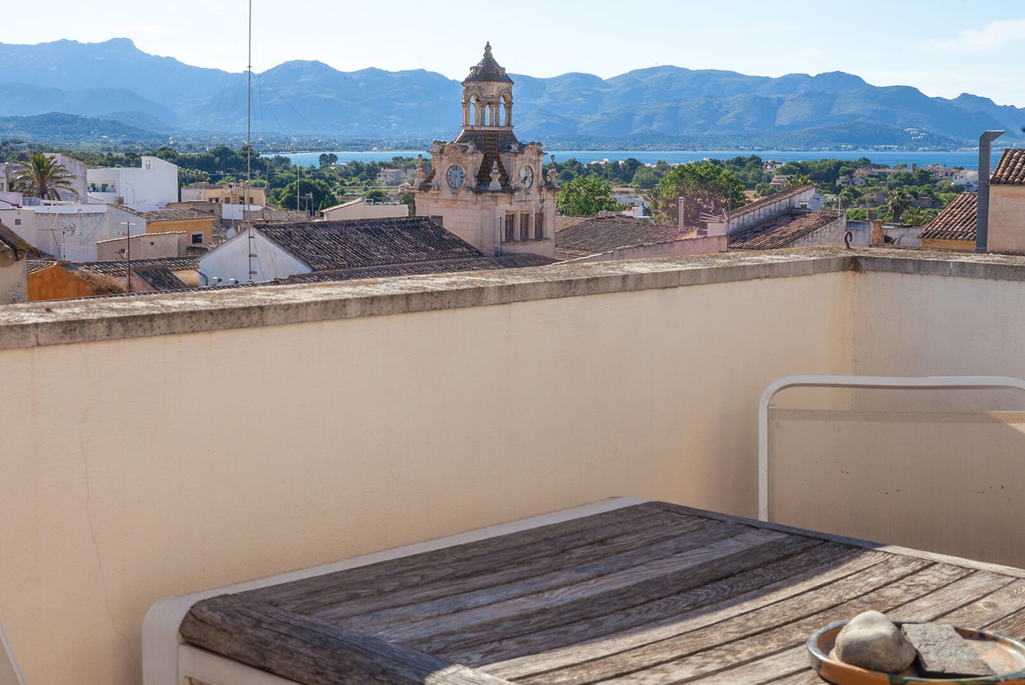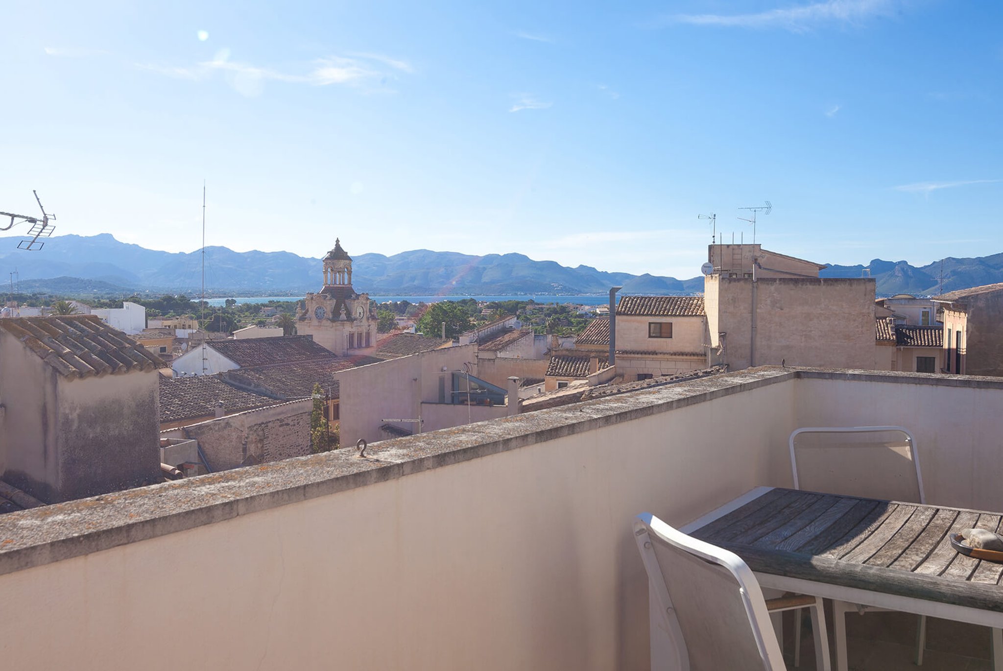 The apartment has a large bright living room, kitchen and two bedrooms, one with an en-suite bathroom, and direct exit to one of the south-facing terraces. The views are unique: overlooking the rooftops of this well-preserved picturesque town in Northern Mallorca. The apartment's best feature is its two large terraces and the amazing views. From one terrace you reach the roof terrace of over 74 m2, with panoramic views of the entire village and both the Pollensa bay and the bay of Alcudia. The mountain Sa Talaia is the only thing that prevents one from seeing directly over to Menorca.