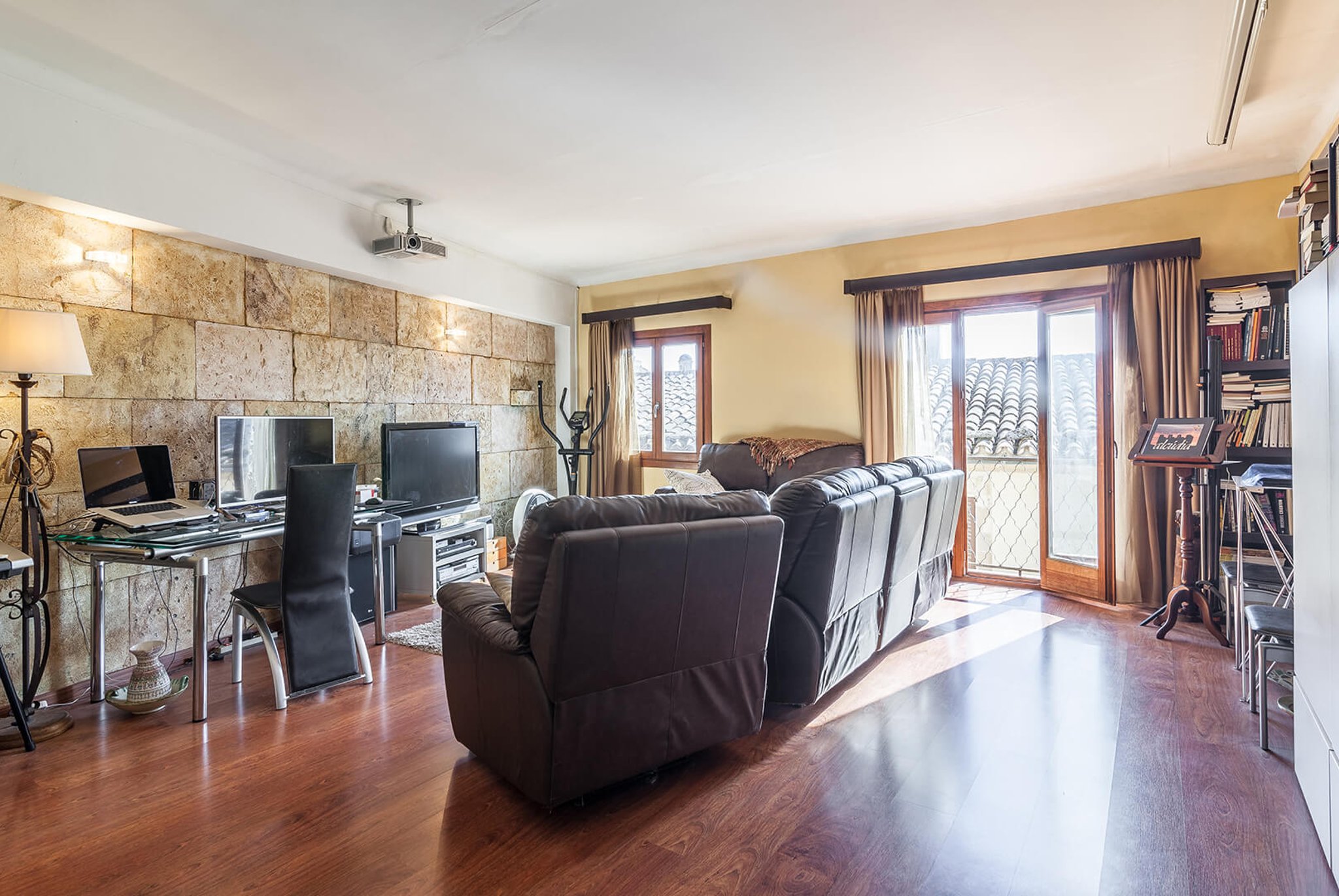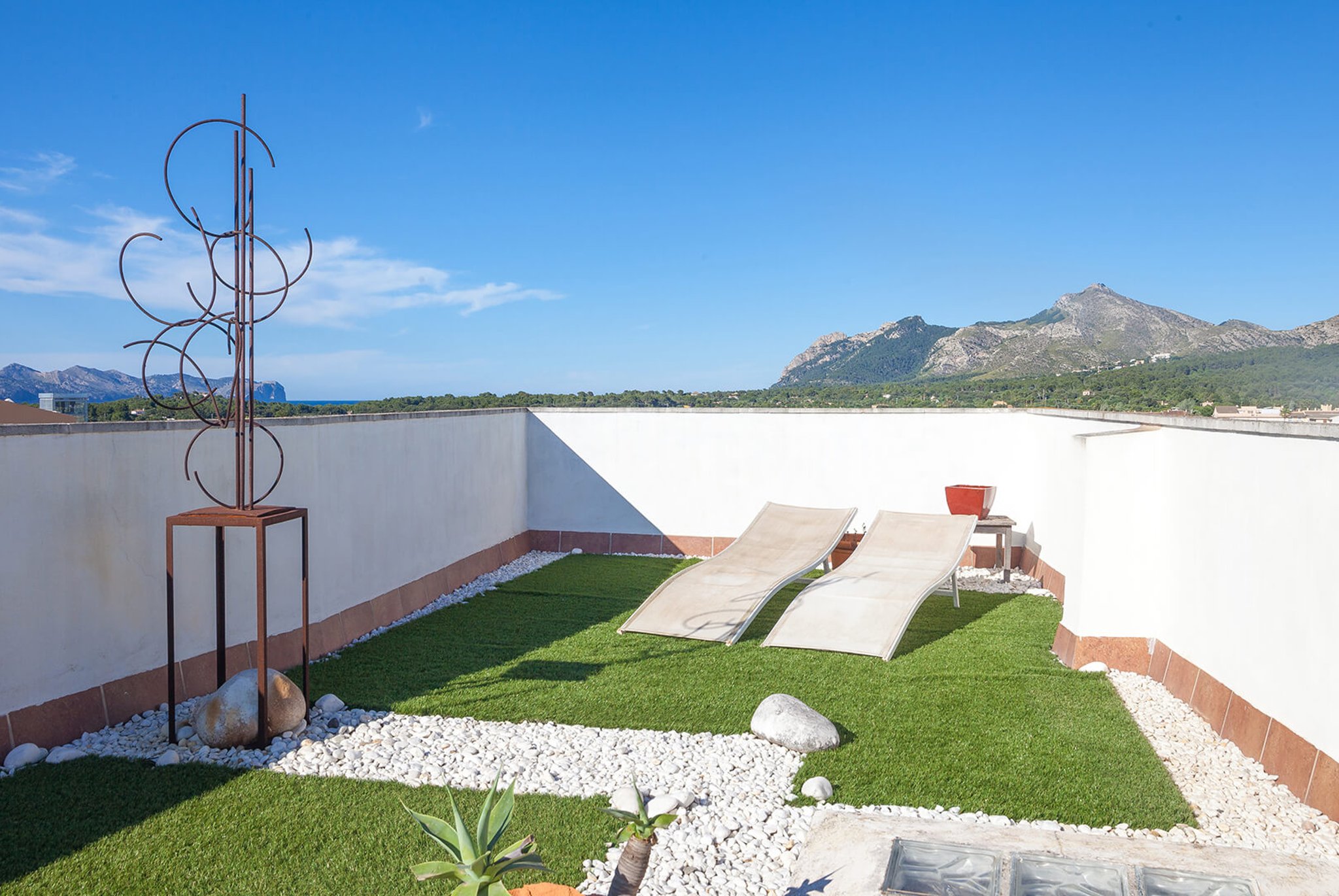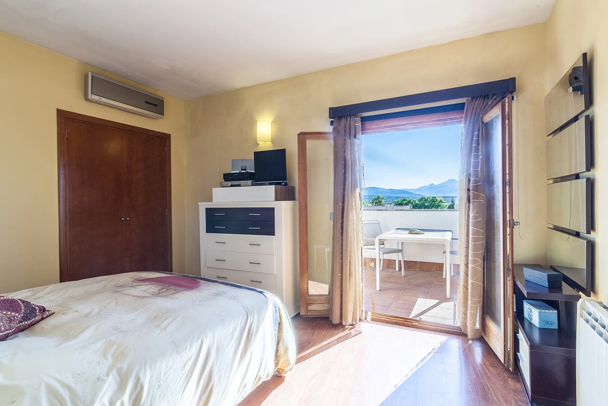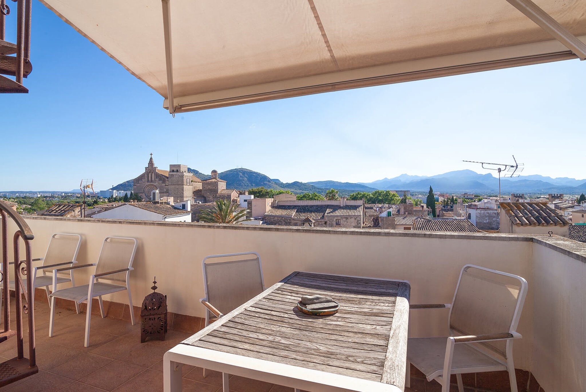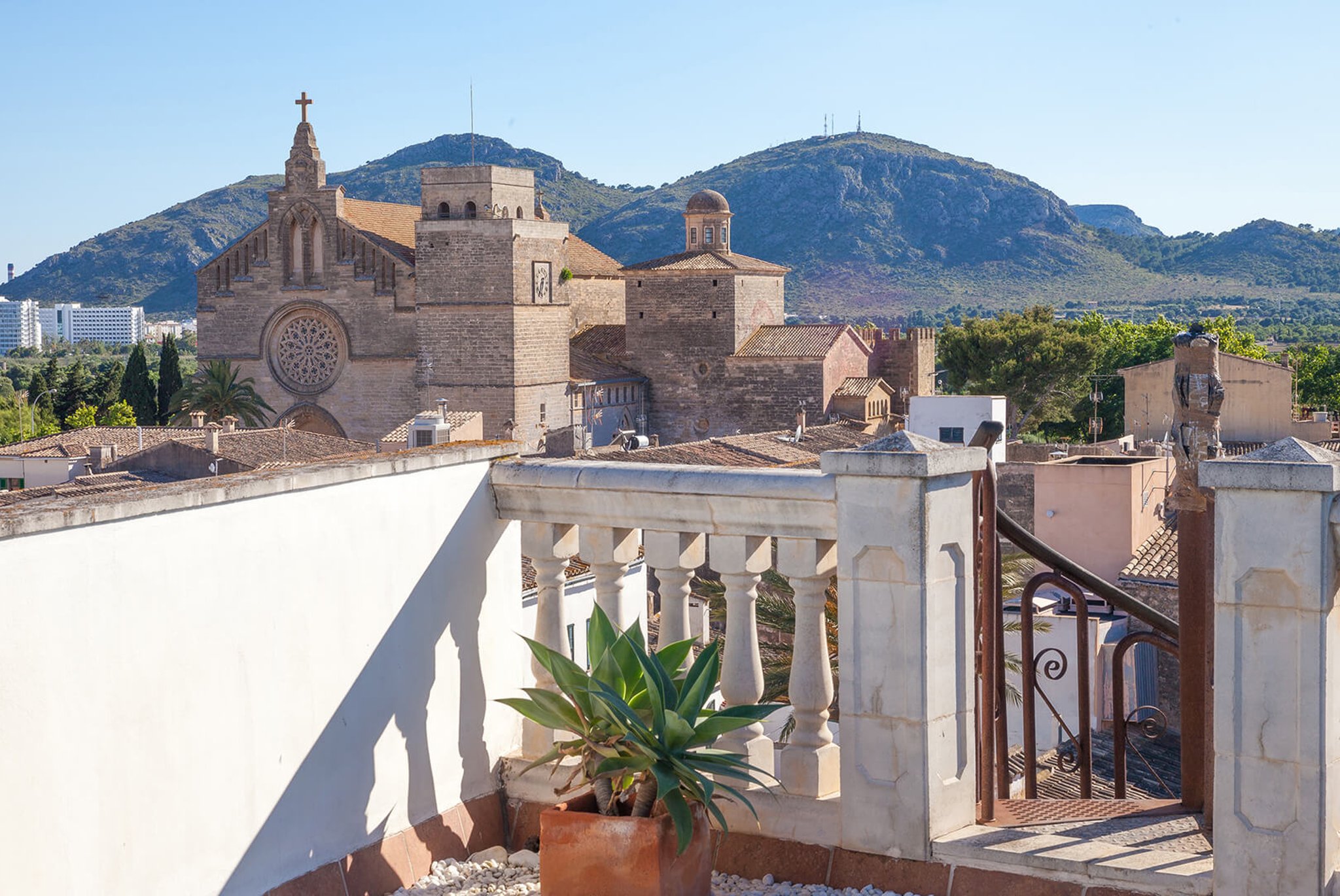 The apartment has a large bright living room, kitchen and two bedrooms, one with an en-suite bathroom, and direct exit to one of the south-facing terraces. The views are unique: overlooking the rooftops of this well-preserved picturesque town in Northern Mallorca. The apartment's best feature is its two large terraces and the amazing views. From one terrace you reach the roof terrace of over 74 m2, with panoramic views of the entire village and both the Pollensa bay and the bay of Alcudia. The mountain Sa Talaia is the only thing that prevents one from seeing directly over to Menorca.