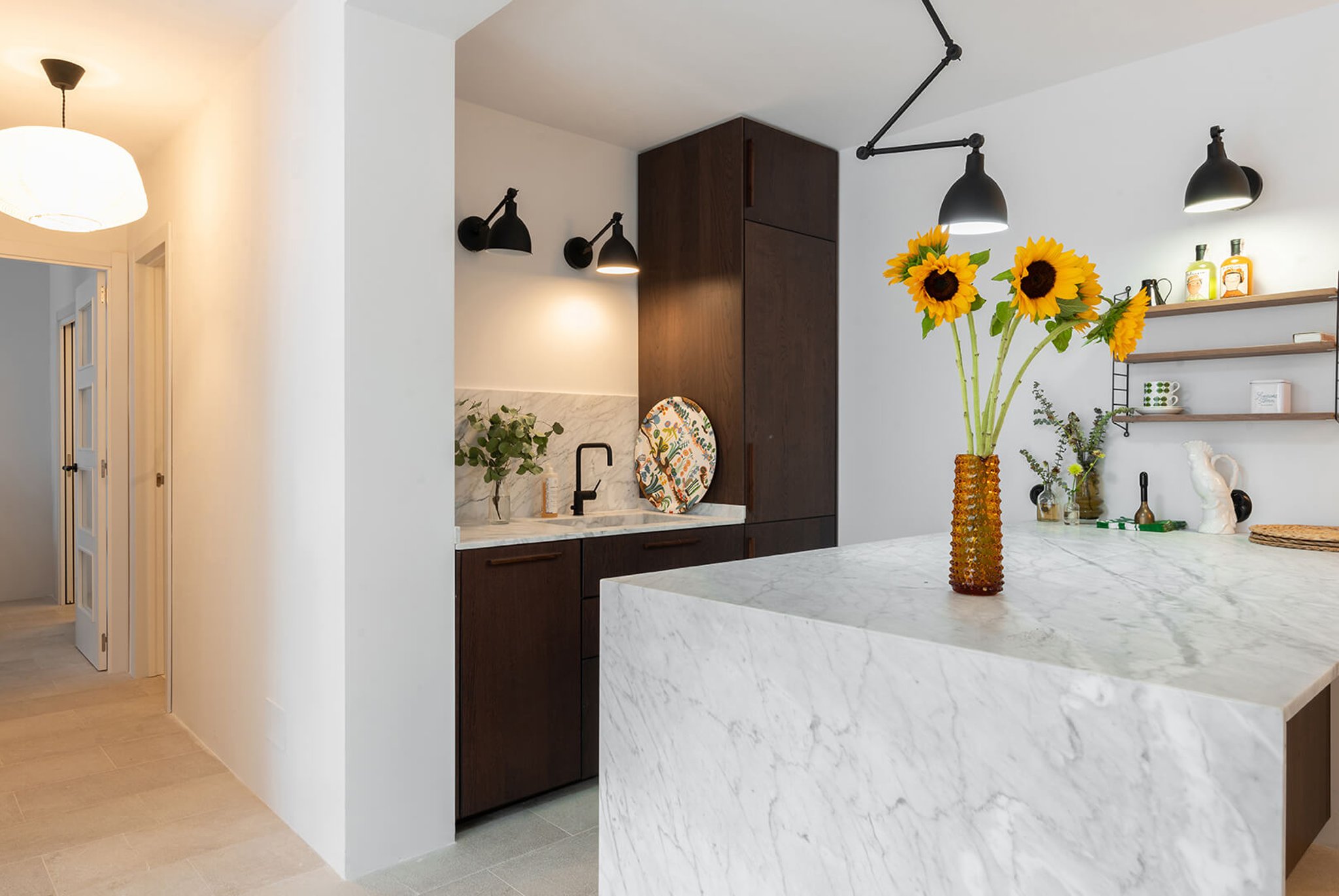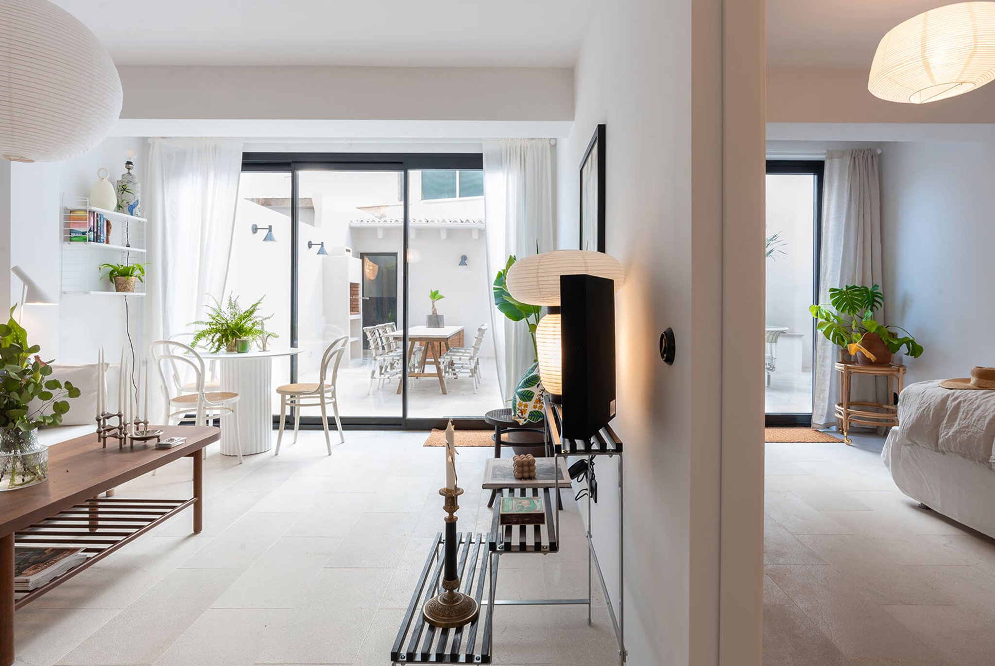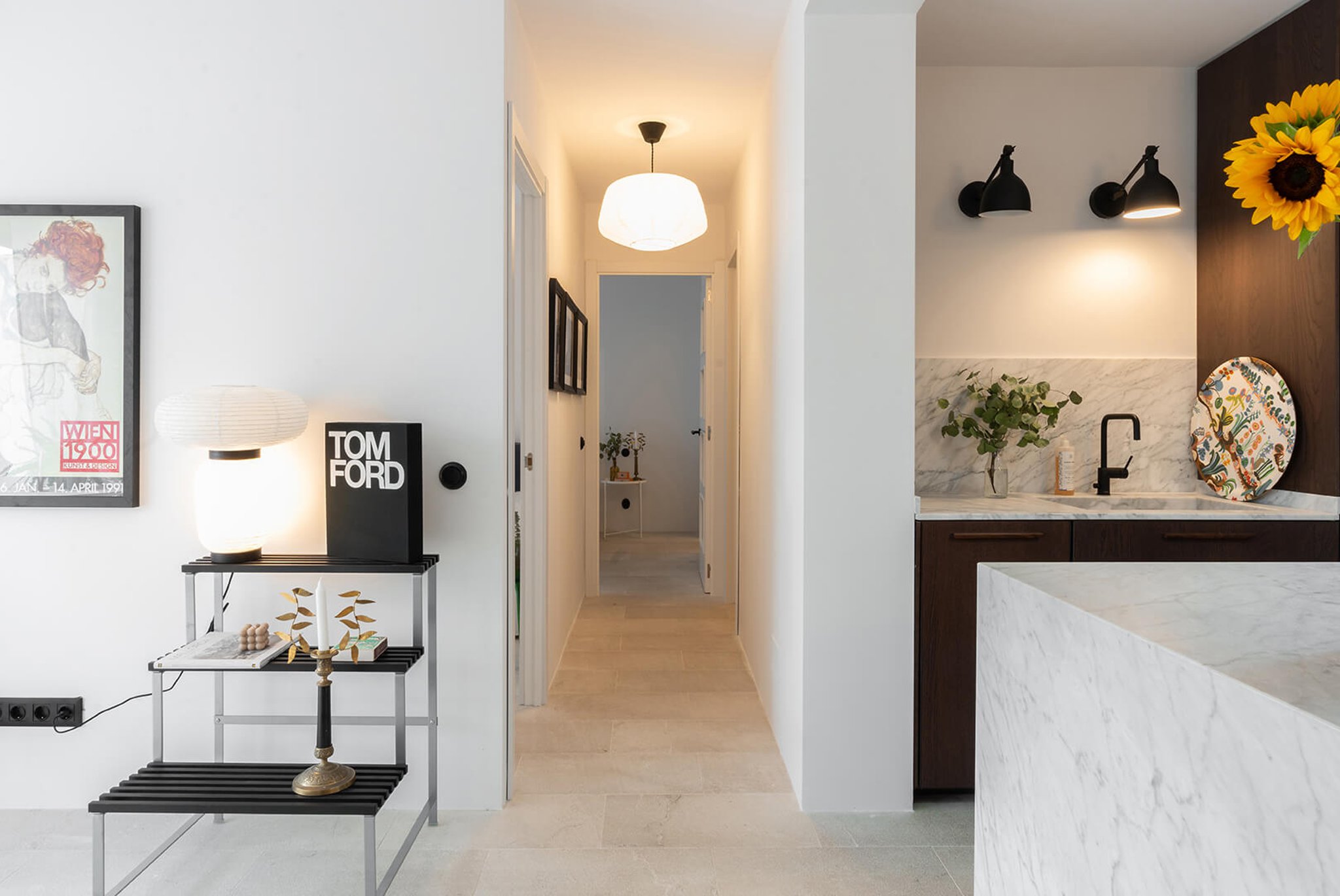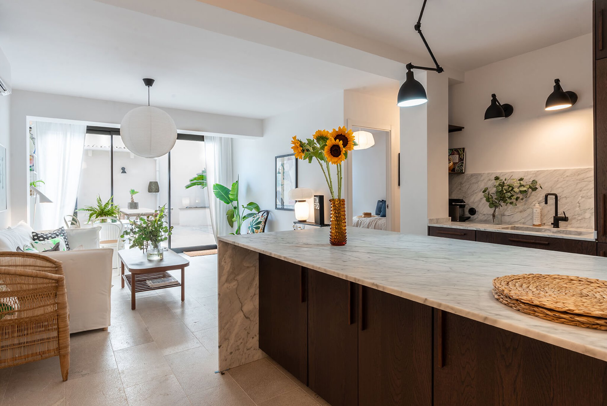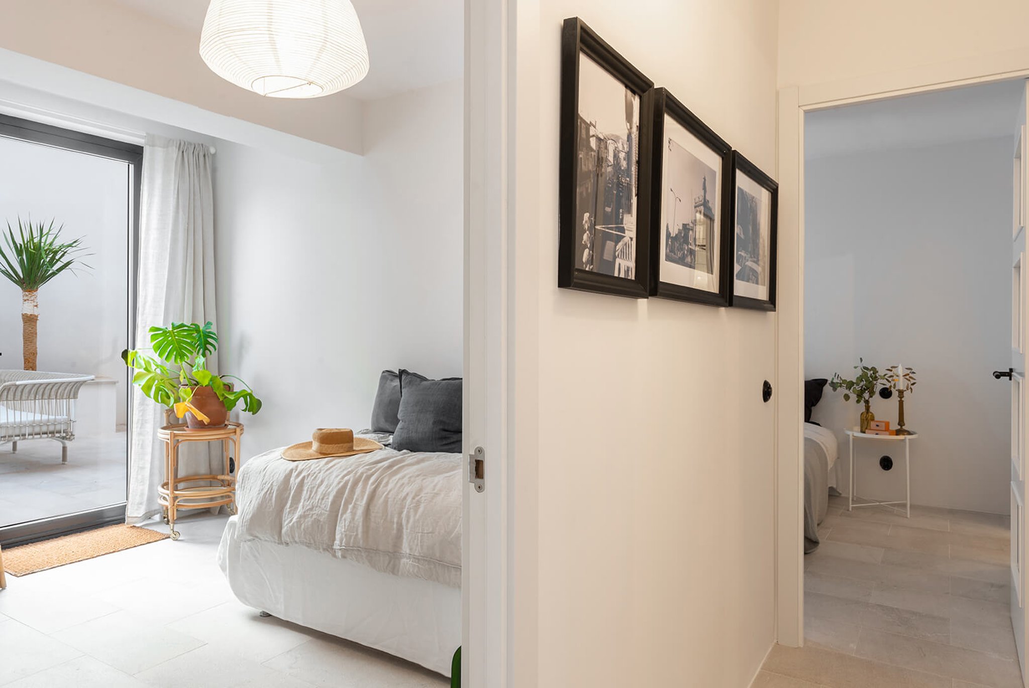 The apartment has a living area of 135 m2 and is located on the ground floor. The living area is distributed over 2 large bedrooms, 2 bathrooms, an office / guest room and an open kitchen and living room. The beautiful kitchen has a generous ceiling height and choice of materials such as Carrara marble, high quality appliances and details in dark wood. Both bedrooms are located next to the living room, which is accessed via sliding doors. The master bedroom has an en-suite bathroom and the independent bathroom has a beautiful terrazzo floor from Huguet. Both bathrooms have underfloor heating. The large terrace of 58 m2 is accessed via sliding glass doors from the living room, and lets in plenty of natural light into the home.