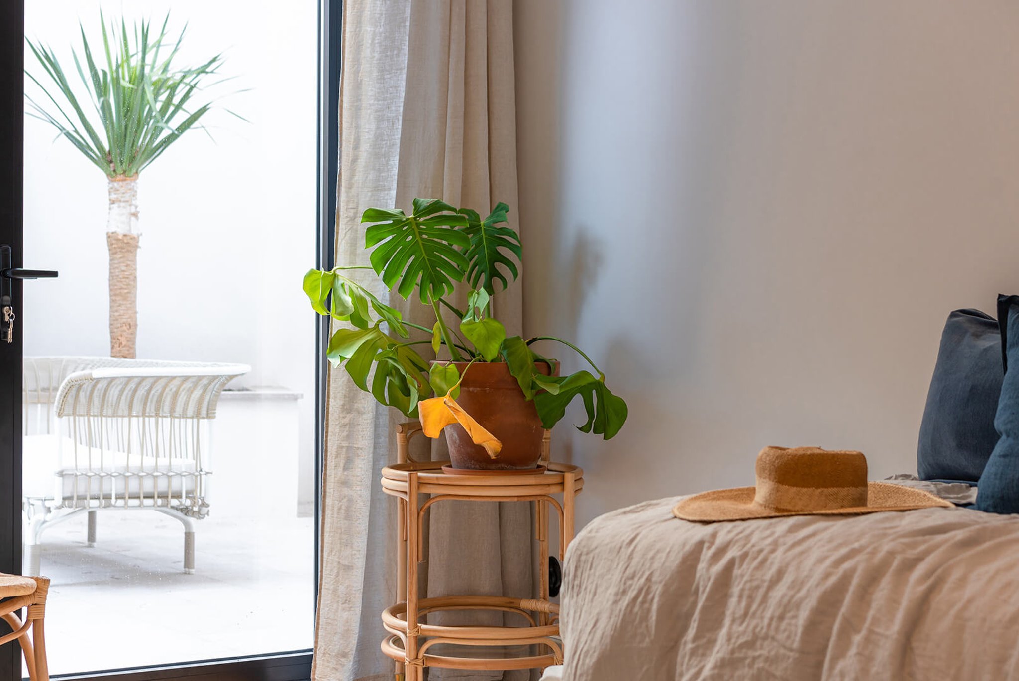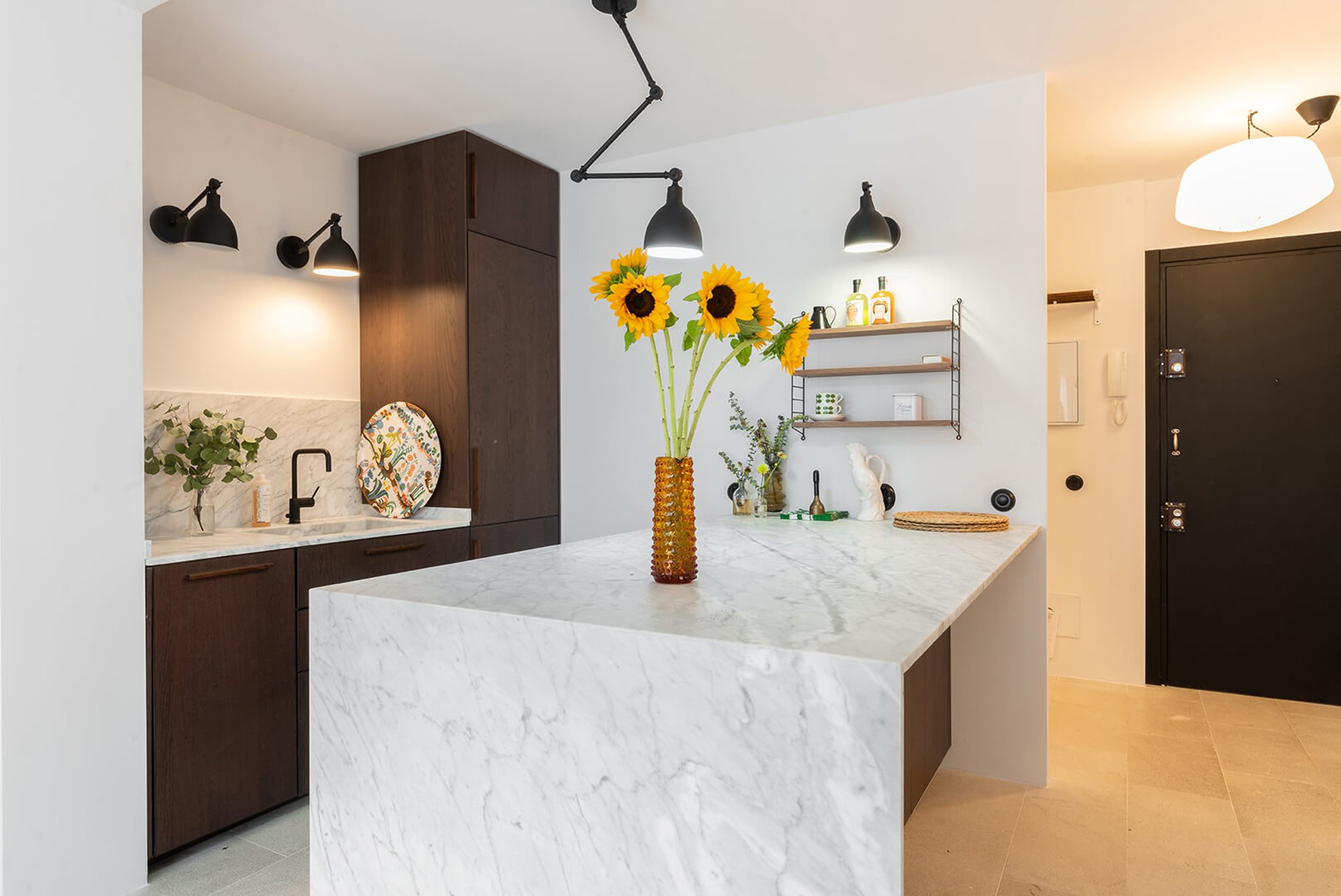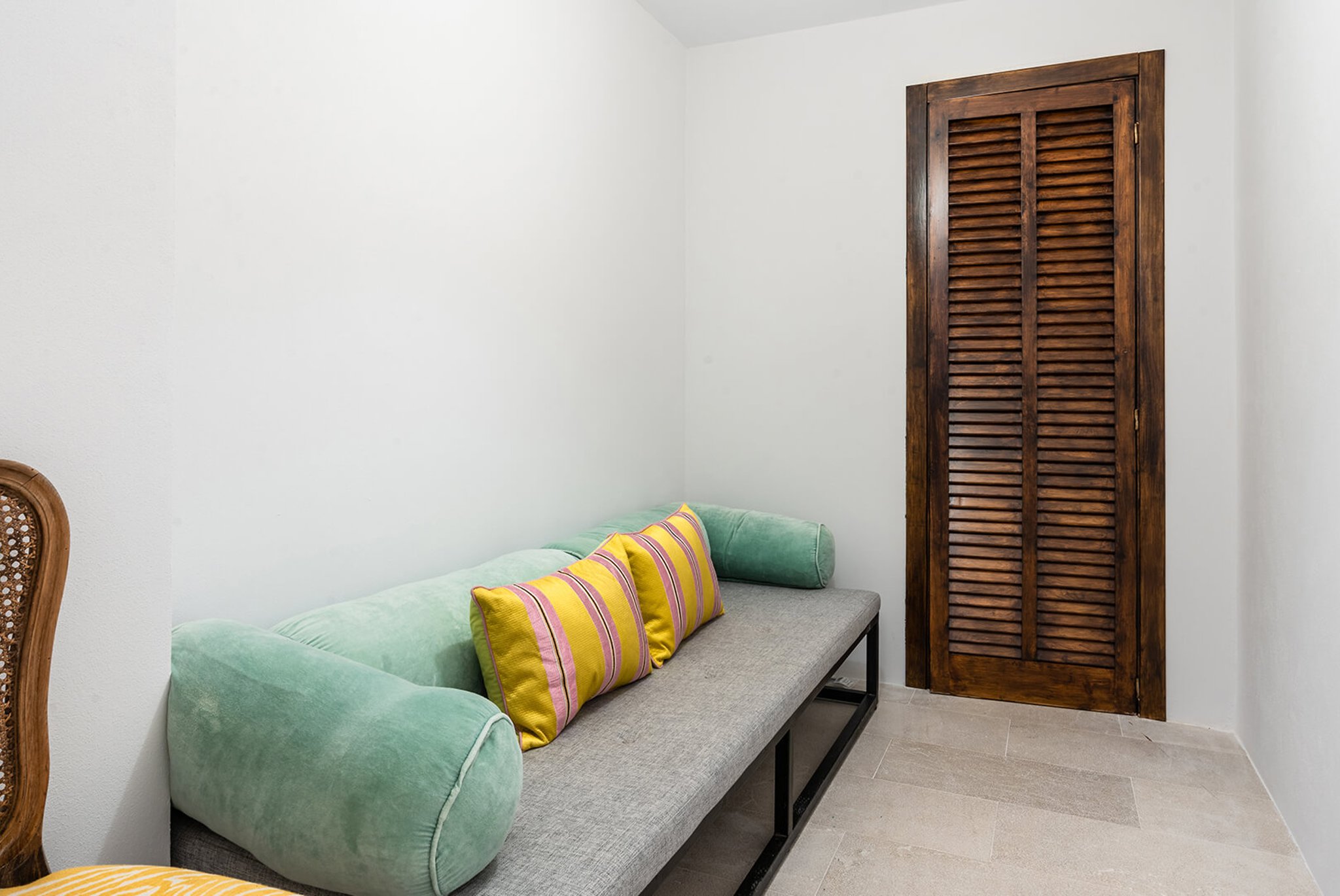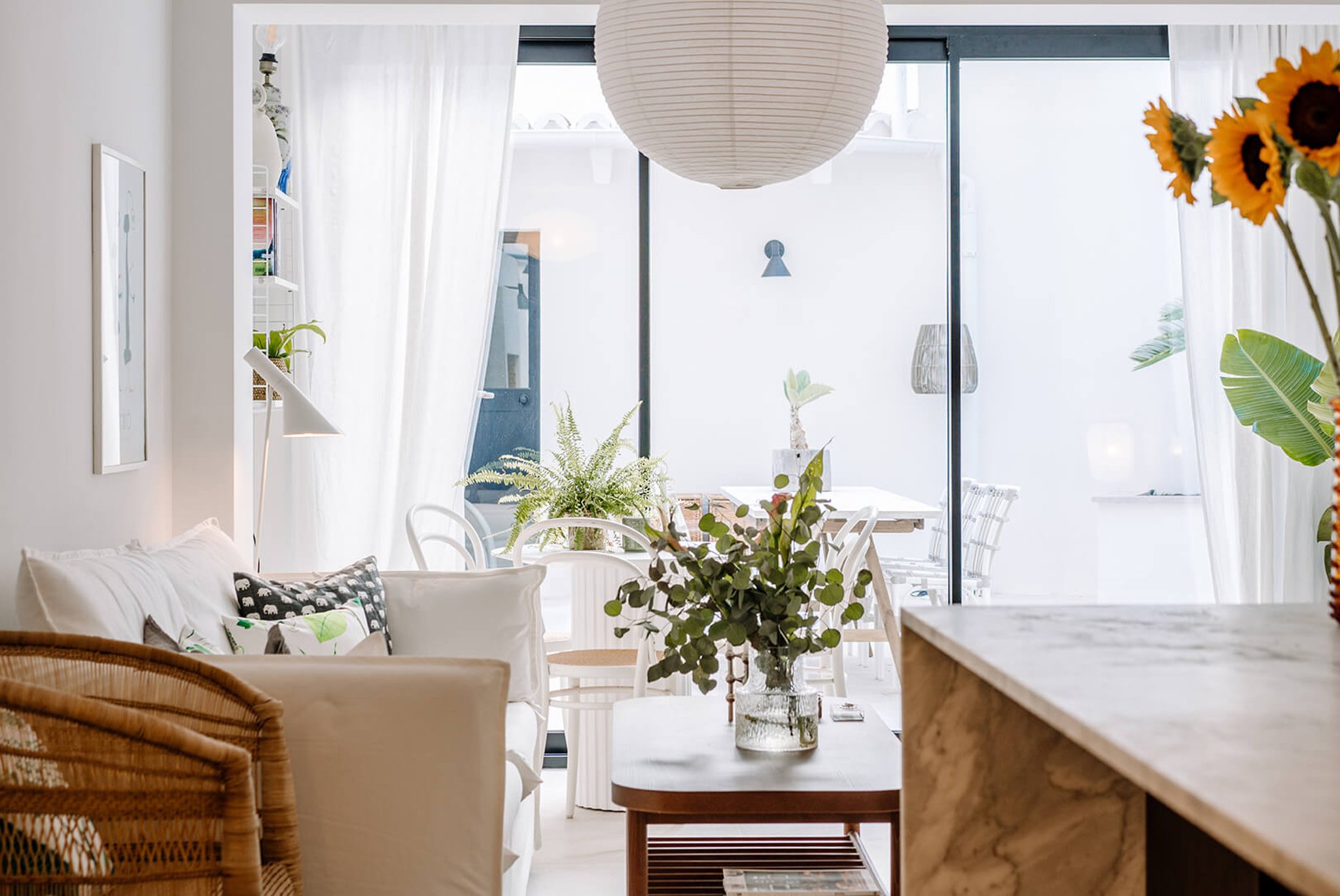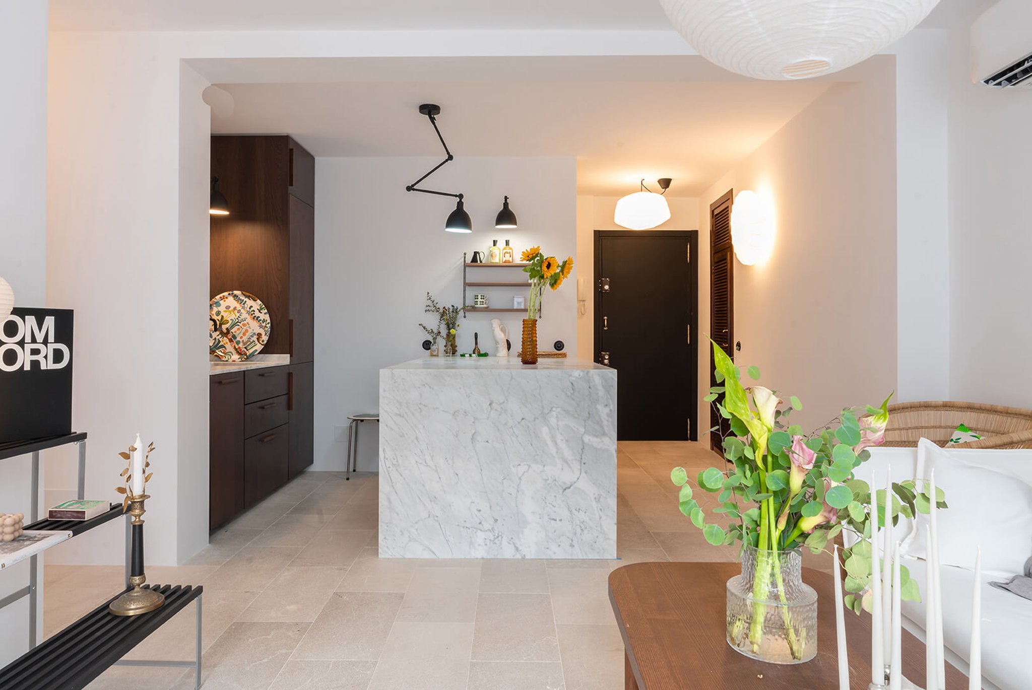 The apartment has a living area of 135 m2 and is located on the ground floor. The living area is distributed over 2 large bedrooms, 2 bathrooms, an office / guest room and an open kitchen and living room. The beautiful kitchen has a generous ceiling height and choice of materials such as Carrara marble, high quality appliances and details in dark wood. Both bedrooms are located next to the living room, which is accessed via sliding doors. The master bedroom has an en-suite bathroom and the independent bathroom has a beautiful terrazzo floor from Huguet. Both bathrooms have underfloor heating. The large terrace of 58 m2 is accessed via sliding glass doors from the living room, and lets in plenty of natural light into the home.