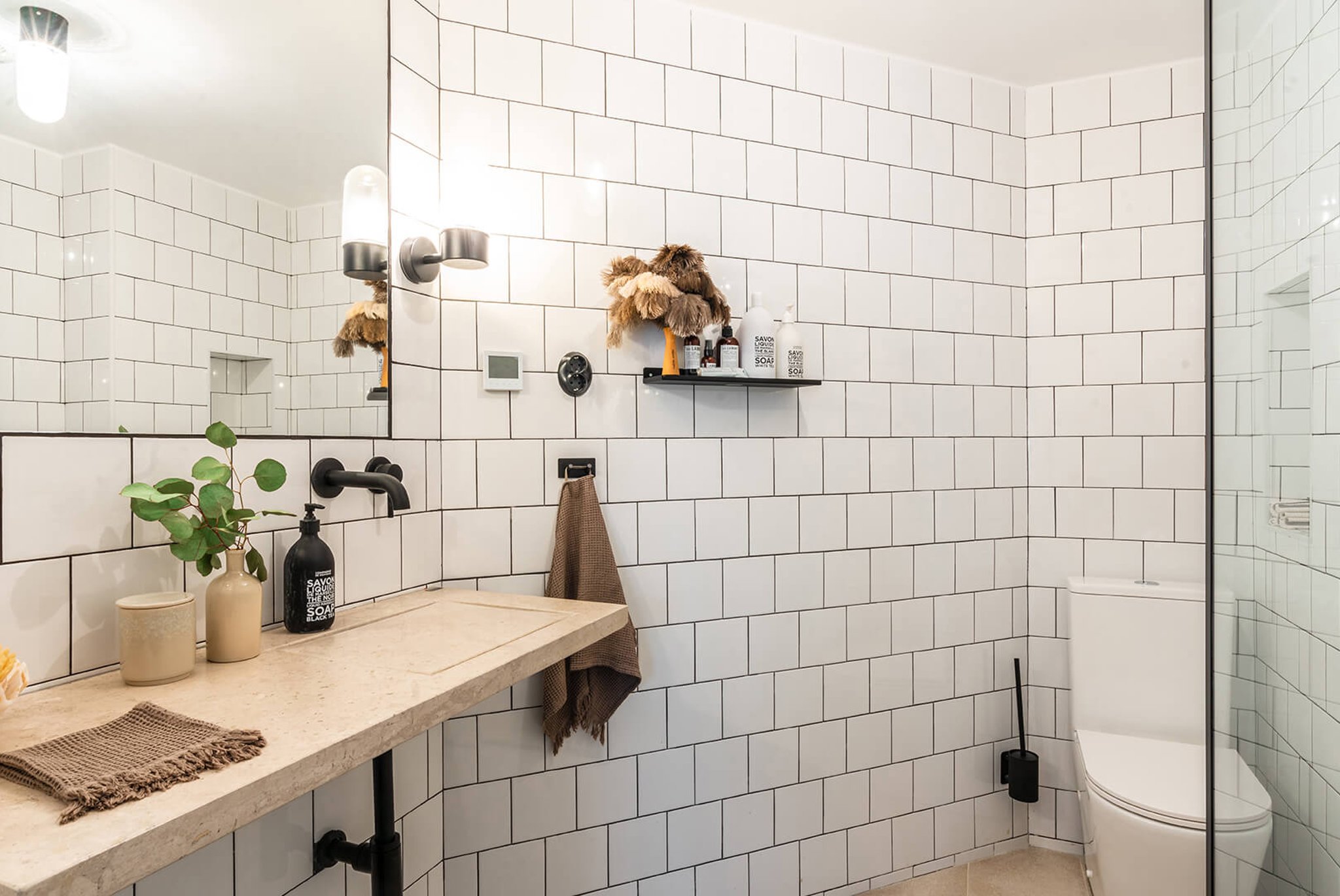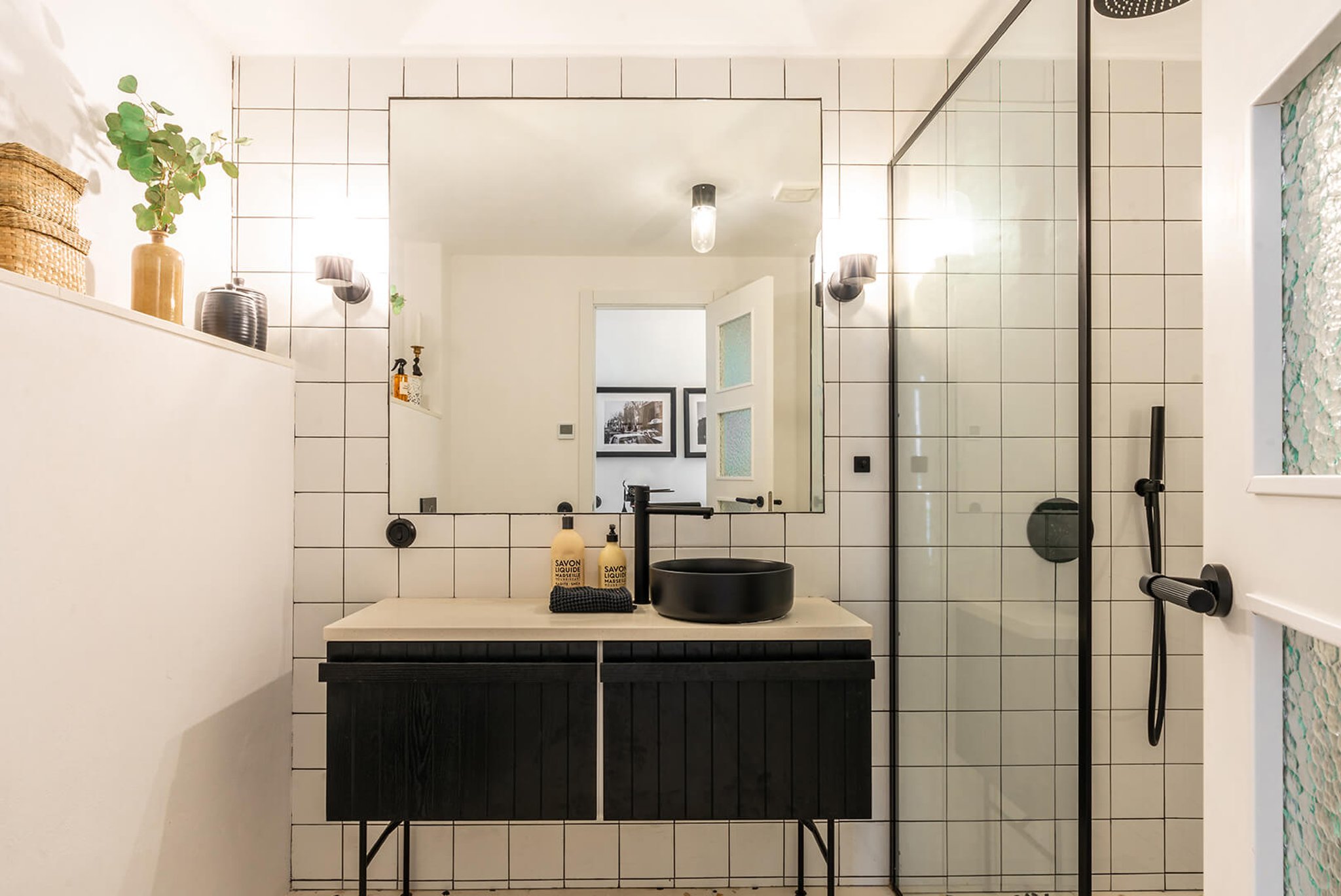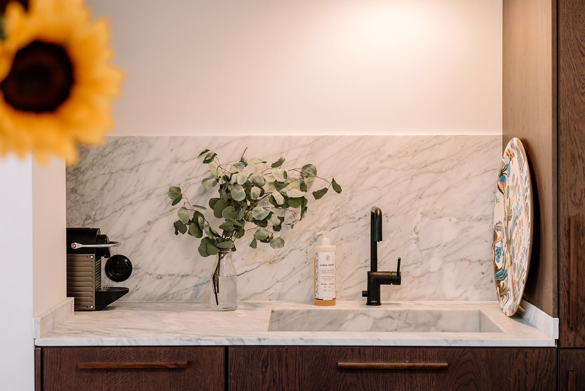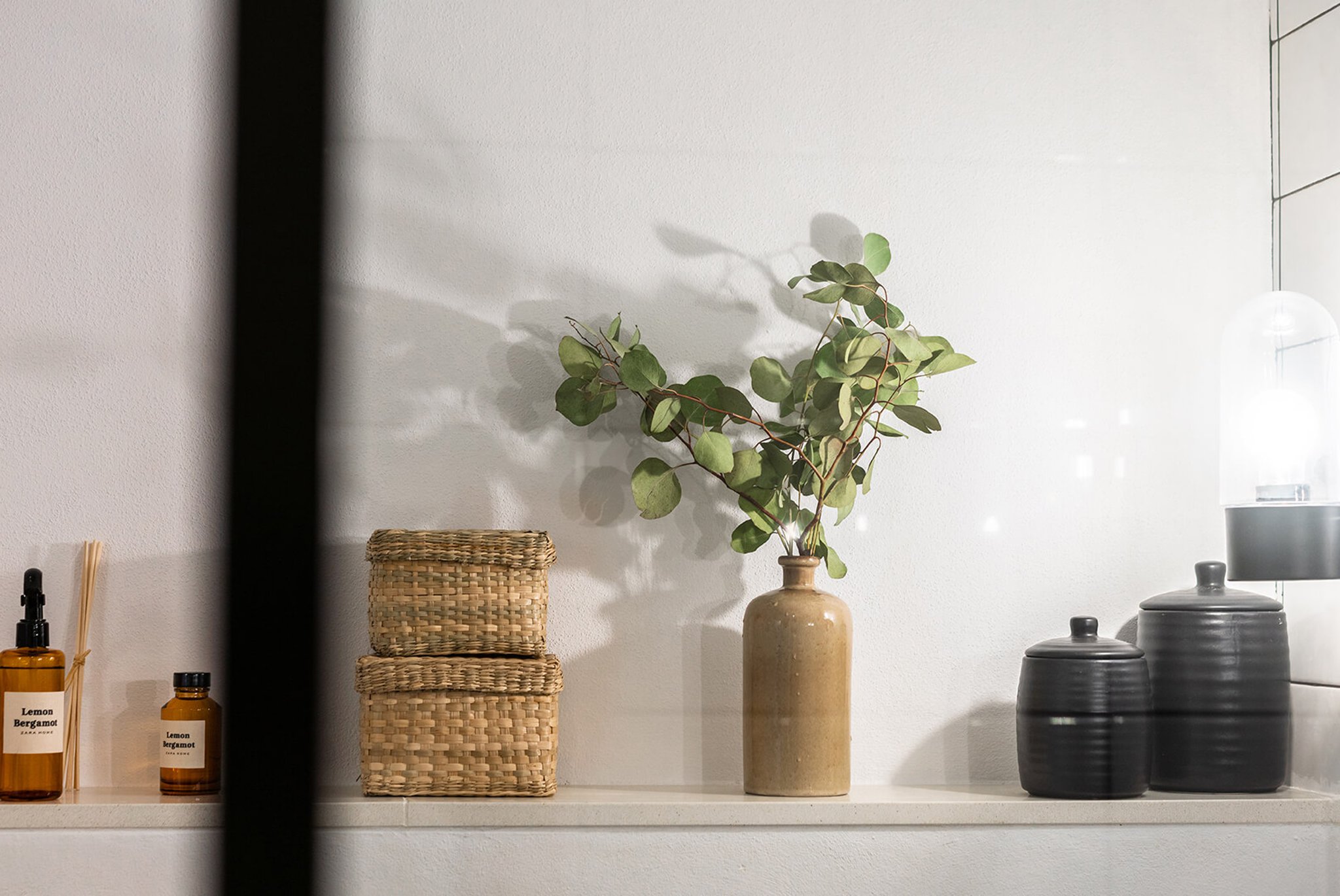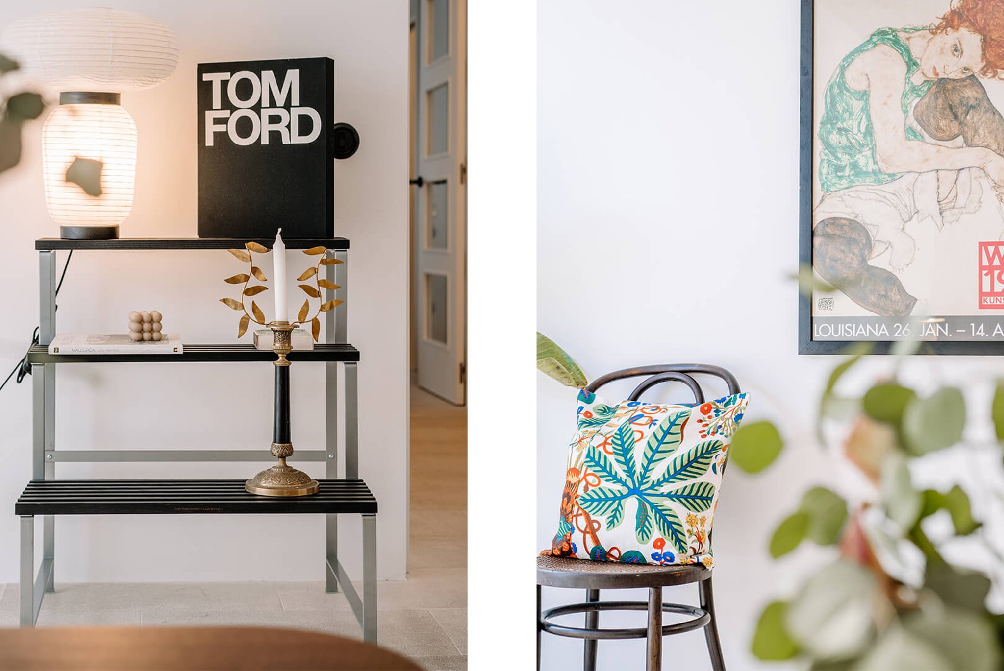 The apartment has a living area of 135 m2 and is located on the ground floor. The living area is distributed over 2 large bedrooms, 2 bathrooms, an office / guest room and an open kitchen and living room. The beautiful kitchen has a generous ceiling height and choice of materials such as Carrara marble, high quality appliances and details in dark wood. Both bedrooms are located next to the living room, which is accessed via sliding doors. The master bedroom has an en-suite bathroom and the independent bathroom has a beautiful terrazzo floor from Huguet. Both bathrooms have underfloor heating. The large terrace of 58 m2 is accessed via sliding glass doors from the living room, and lets in plenty of natural light into the home.