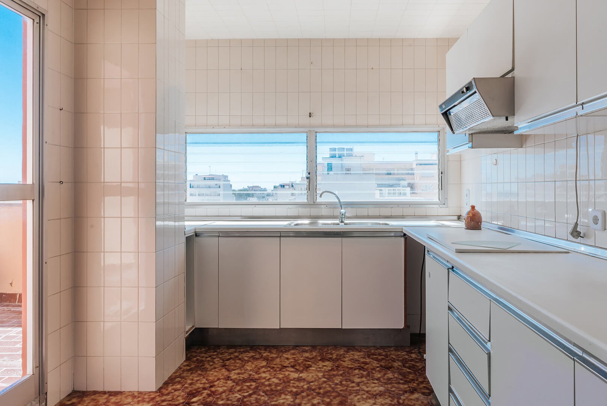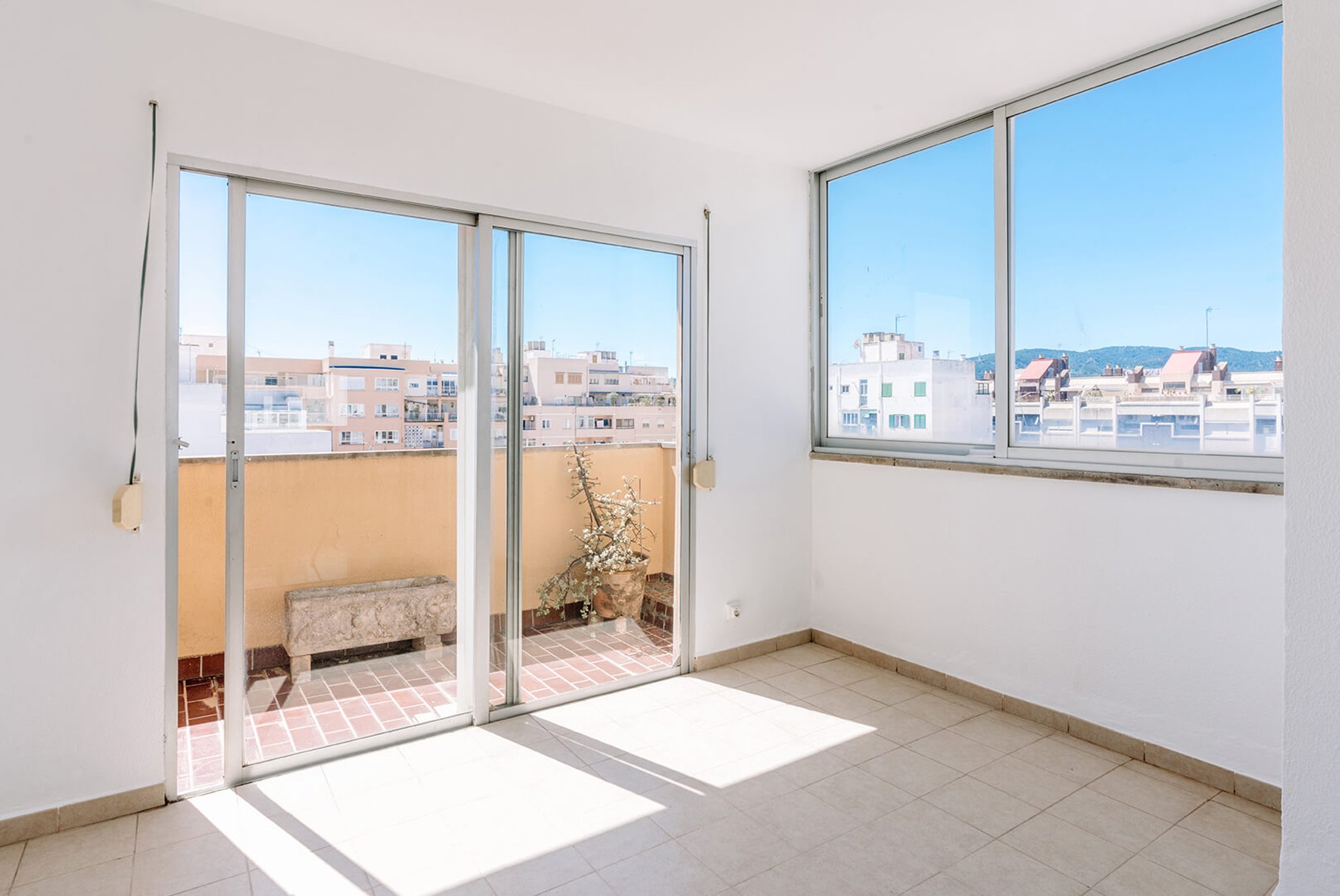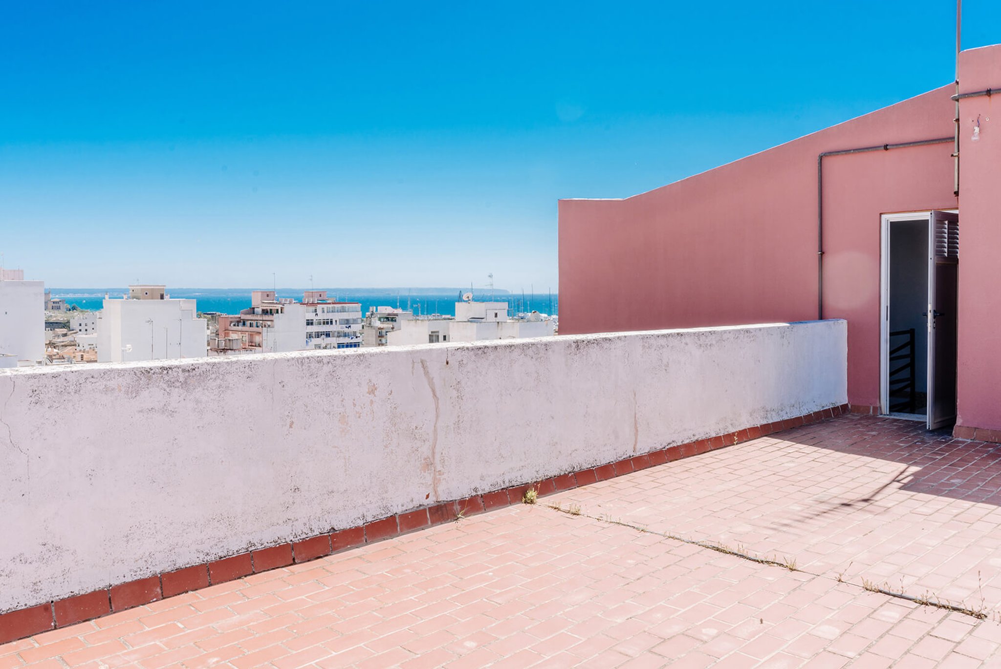 The apartment covers the top floor of a building of seven floors and two entrances. This home has several terraces, 4 bedrooms, 3 bathrooms, kitchen and living room on the entrance level. One level up there is an additional bedroom / storage / office with another bathroom. The apartment is in need of a renovation but has incredible potential!
