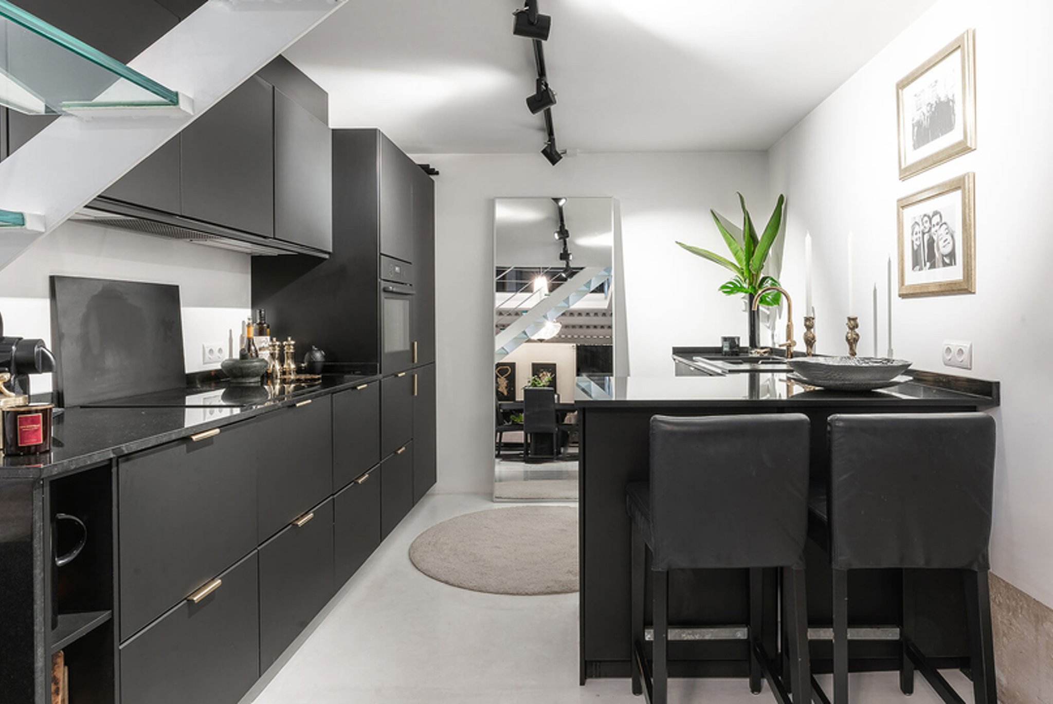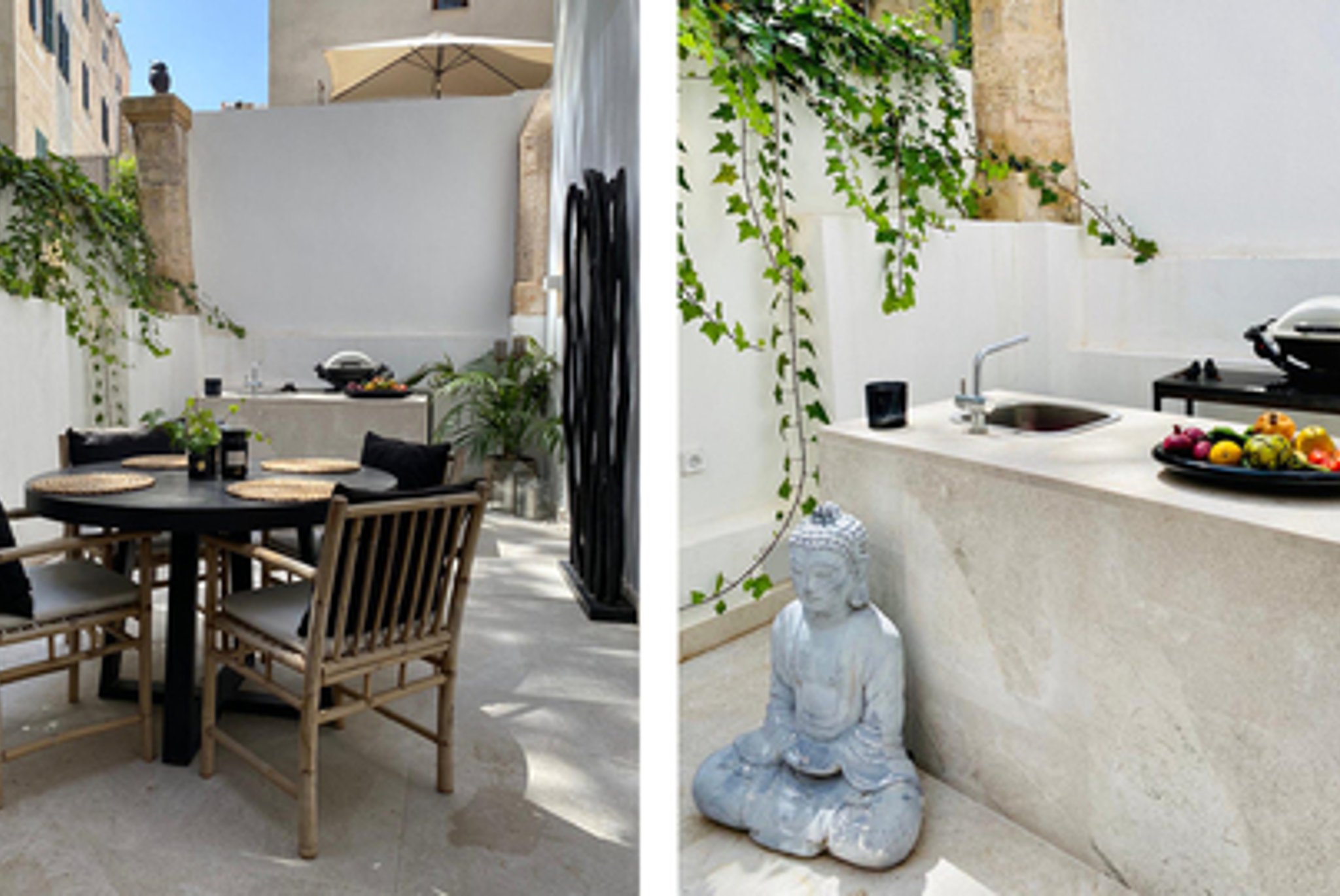 The apartment has a living area of 123 m2 and is distributed on two levels. The living room with dining area and the open, fully equipped kitchen is located on the ground floor. The bedroom is located on the upper level where we also find the bathroom and an area that can be used as a study, extra bedroom or TV room as well as the patio of 37 m2. The bedroom has built-in wardrobes with lots of storage space. The terrace can be reached both from the bedroom as well as from the top of the stairs. The lovely terrace has plenty of space for outside furniture and there is also an outside kitchen in stone. The kitchen and bathroom were renovated in 2019. The whole property has white floors of micro cement.